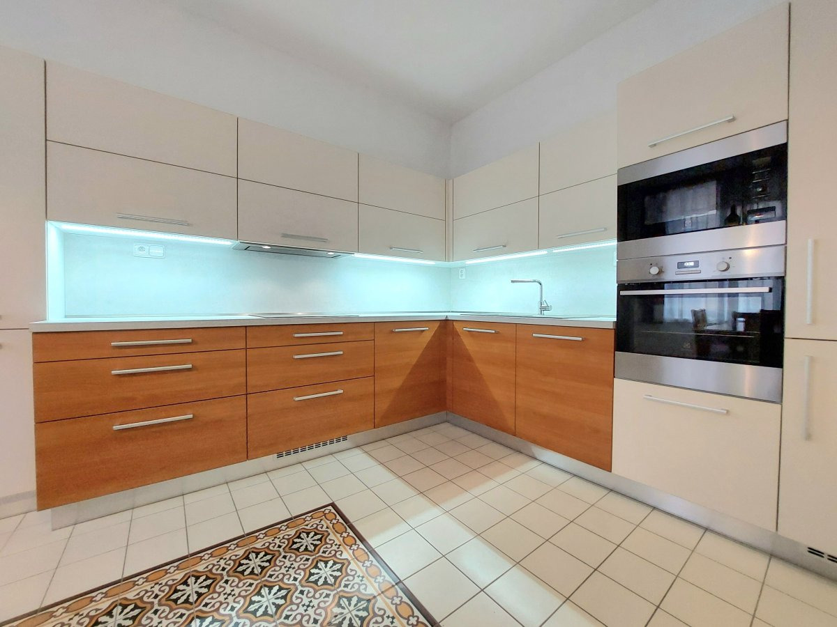 Byt se nabízí vybavený. Kuchyně disponuje lednicí, myčkou, elektrickou troubou, varnou deskou, mikrovlnnou troubou a digestoří. Je zde i jídelní stůl s židlemi. Obývací část je zařízena pohovkou, konferenčním stolem, komodou a knihovnou. Jsou zde i funkční krbová kamna. Součástí ložnice je postel s nočními stolky, šatna a úložný prostor u stropu. V koupelně je sprchový kout, umyvadlo, toaleta, pračka a vstup na balkón.