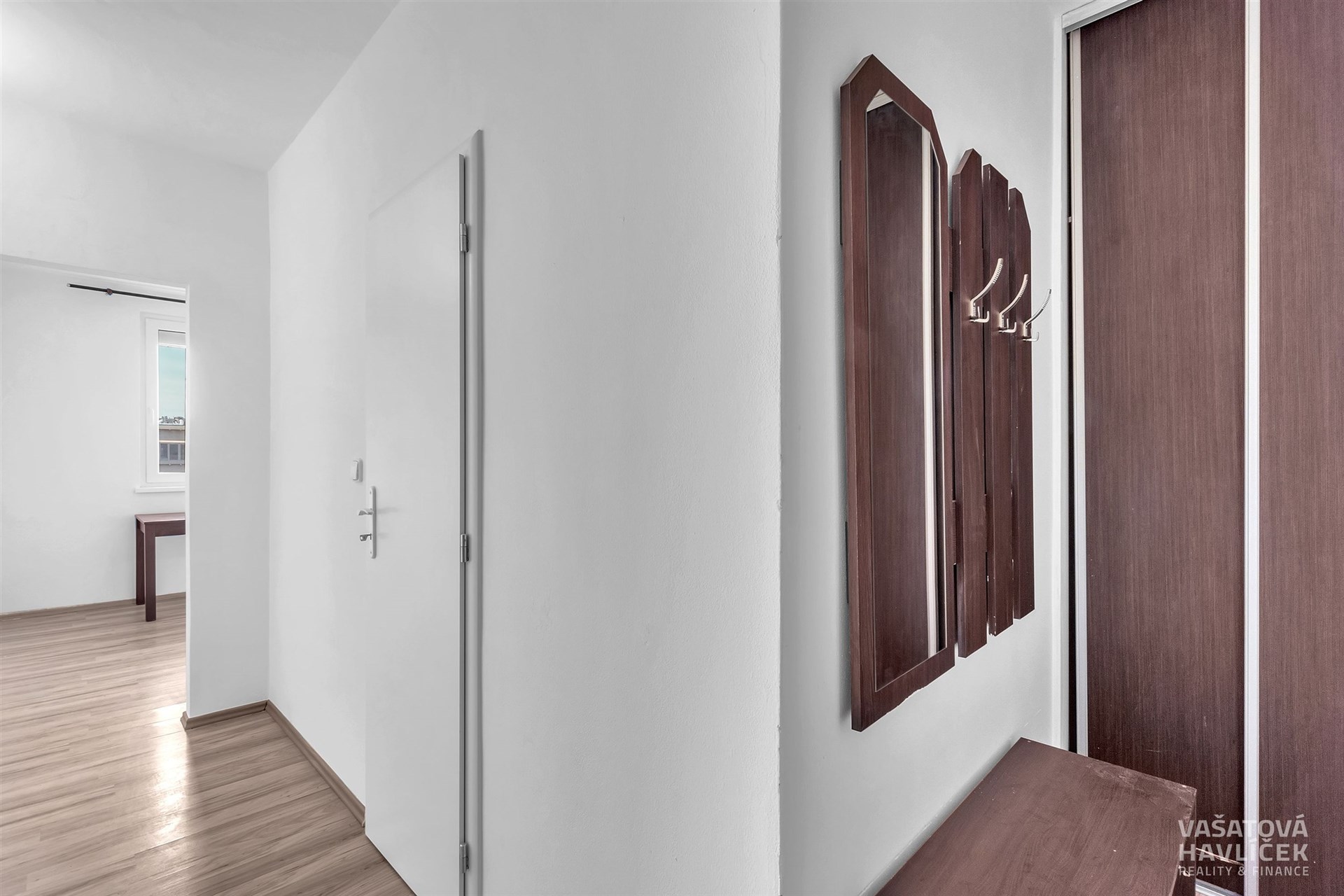 > stůl, vestavěná skříň v chodbě botník, věšák