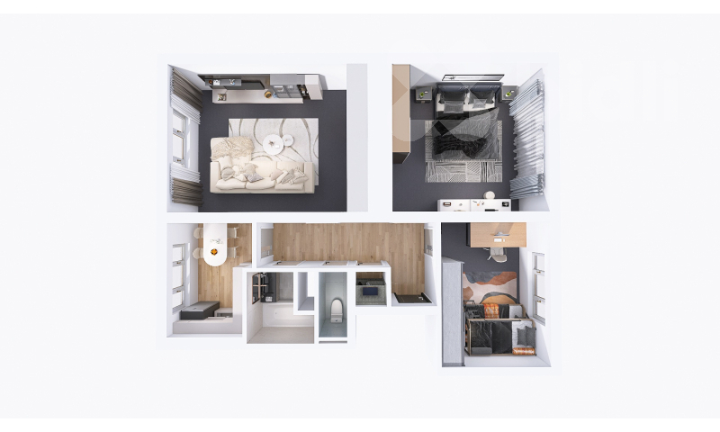 Po vstupu do bytu vás přivítá prostorná chodba. Hned vpravo se nachází první pokoj - pro lepší představu o jeho potenciálu jsme pro vás připravili vizualizaci, jak může prostor vypadat po nastěhování. Rovně z chodby pak vstoupíte do druhého, většího pokoje. Obě tyto místnosti jsou orientovány do klidného vnitrobloku, což z nich činí ideální ložnici a dětský pokoj či pracovnu.