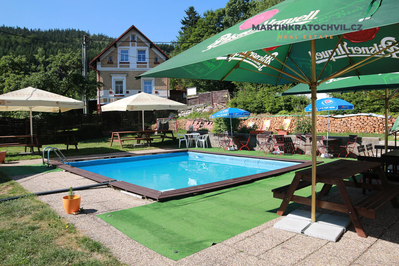 Z restaurace je východ na letní zahradu s posezením, dětským hřištěm a s bazénem 6x6 m2. Na pozemku je možné přistavět 1 podlažní bungalov, vedle penzionu jsou parkovací místa na vlastním pozemku.