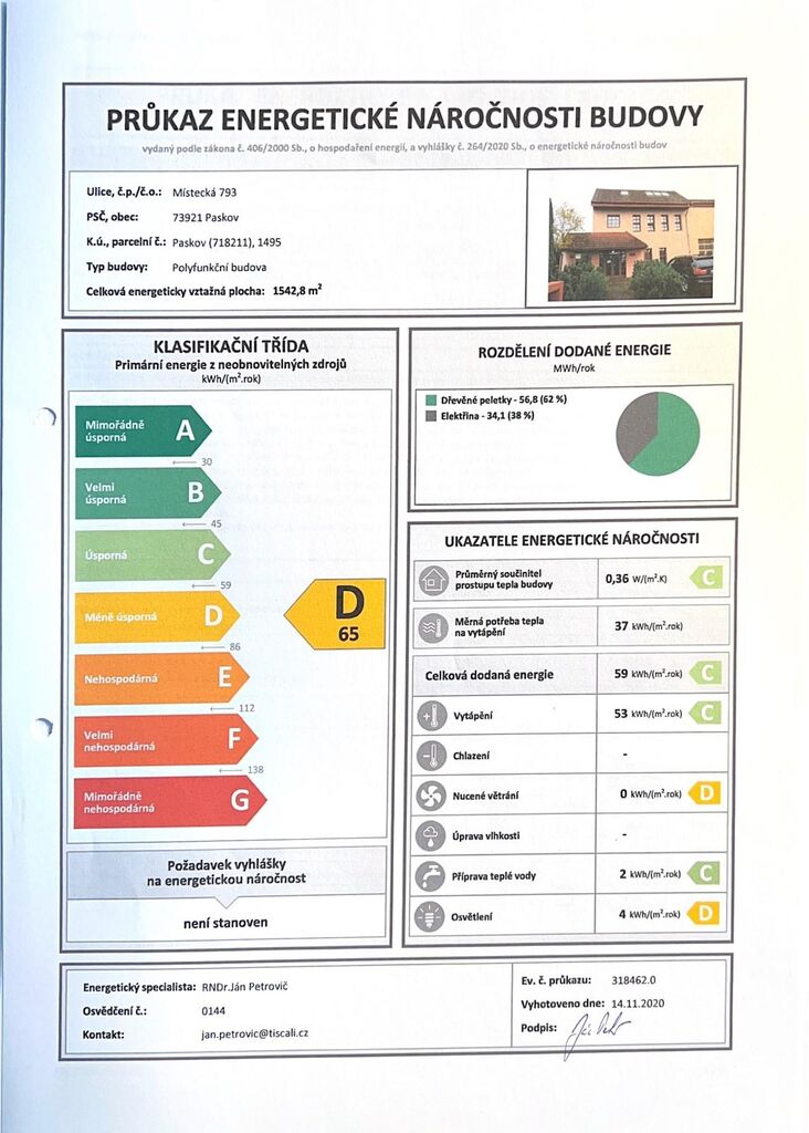 Ukazatel energetické náročnosti budovy:65 kWh/m²