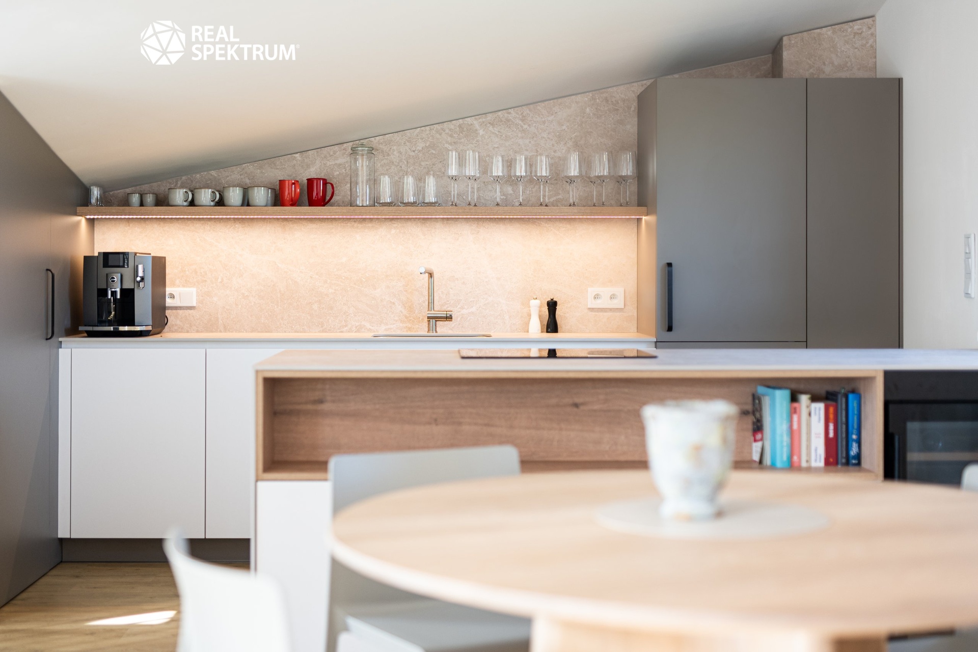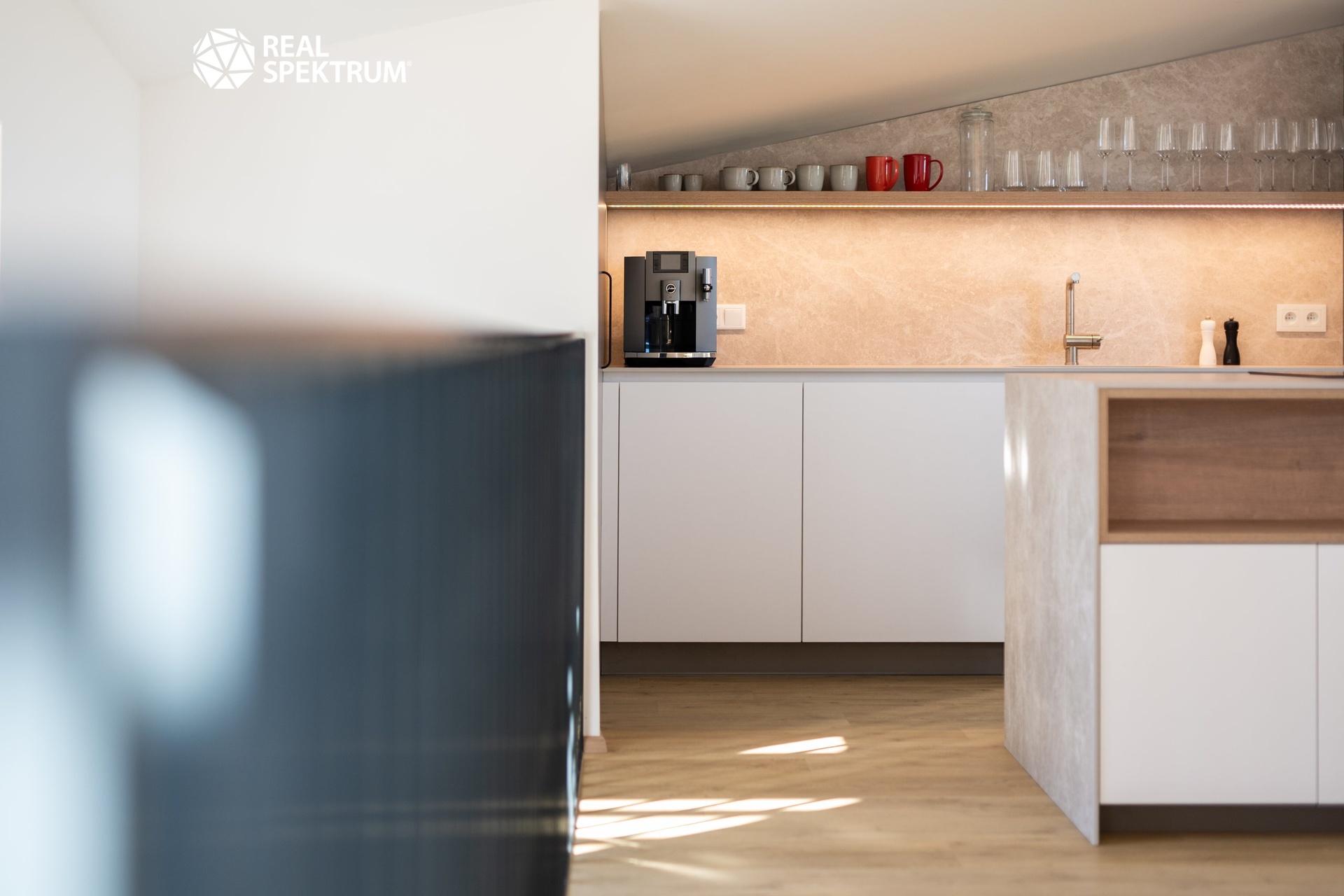 Interiér bytu je navržen s důrazem na detail – kvalitní nábytek na míru, designová kuchyňská linka vybavená spotřebiči Siemens a Bosch a předokenní elektrické žaluzie poskytují vysoký komfort a nadstandardní úroveň bydlení.