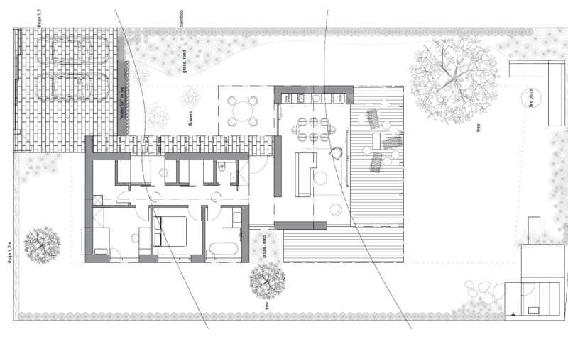 K domu náleží terasa, okrasná zahrada s automatickou závlahou napojená na retenční nádrž a vlastní studnu. K dispozici jsou 2 parkovací stání na pozemku a dobíjecí stanice pro elektromobil. Nemovitost je z inženýrských sítí napojena na obecní vodovod, kanalizaci a elektřinu.