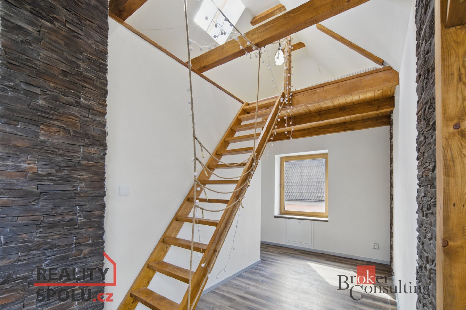 V horním patře je pracovna (9,68 m2), šatna (7,52 m2) a otevřený prostor s přiznanými trámy (47,84 m2). A i zde se nachází samostatná terasa (cca. 37,65 m2) přístupná z tohoto podlaží.