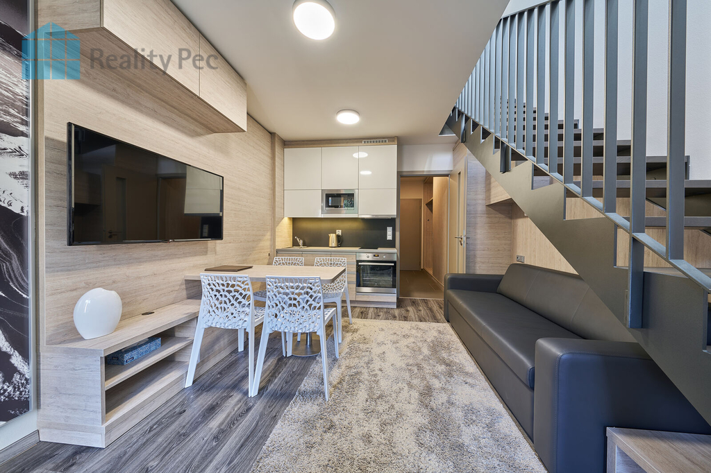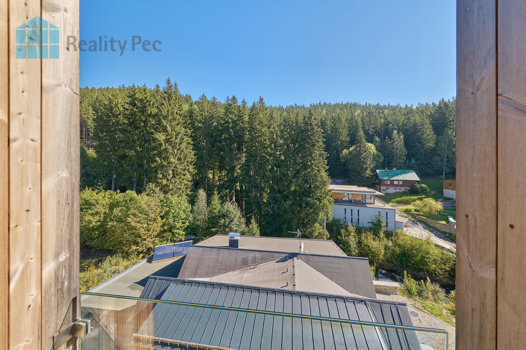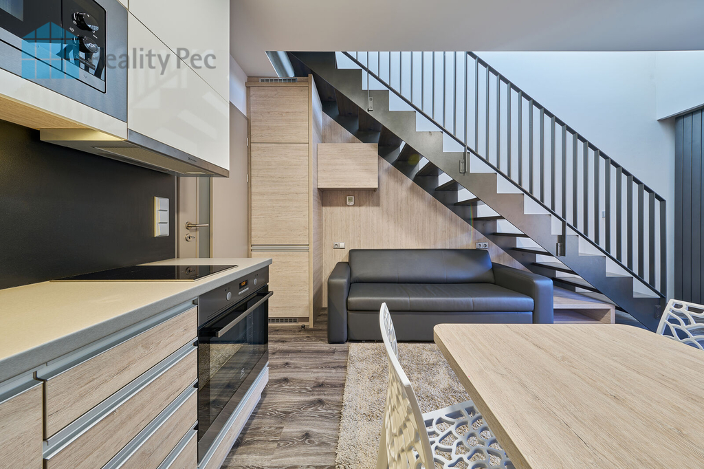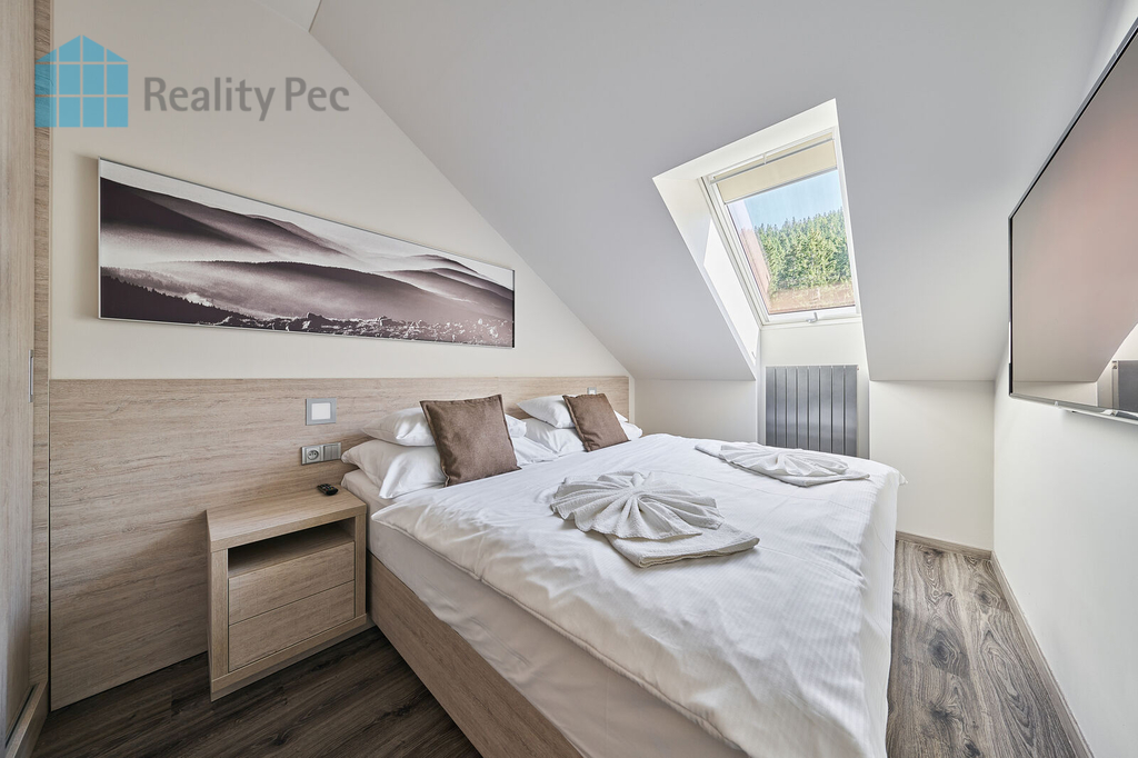 Nabízíme k prodeji luxusní, dvoupatrový mezonetový byt o dispozici 2 + kk se dvěma koupelnami v samém centru Pece pod Sněžkou. Tento kompletně vybavený byt se