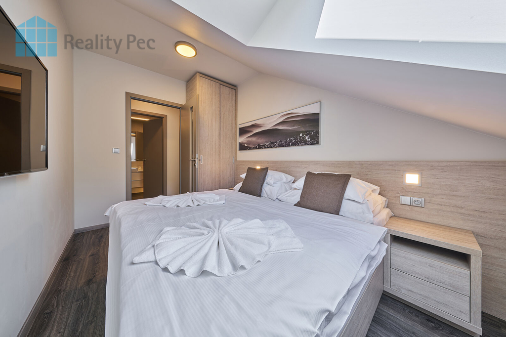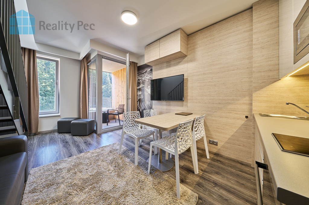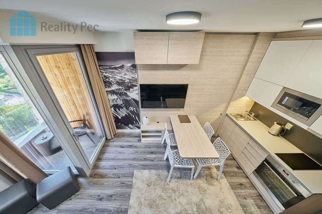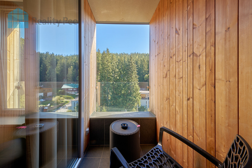 Byt se nachází ve 4. a 5. podlaží 5-podlažního cihlového objektu a disponuje podlahovou plochou 52 m². K dispozici je také terasa o rozloze 1.8m² s úchvatným výhledem na okolní krajinu. Zcela kompletní vybavení celého apartmánu je , moderní, funkční a nabízí obývací pokoj s kuchyňským koutem včetně vybavení, ložnici, komoru a dokonce dvě koupelny s toaletou . K bytu náleží parkovací místo v parkovací garáži a soukromý skibox odkud se do bytu pohodlně dostanete výtahem. Byt se prodává do osobního vlastnictví, v domě je funkční společenství bytových jednotek a zároveň je možno využívat hotelových služeb jako je úklid, výměna ložního prádla či skvělá snídaně v restauraci v přízemí objektu. Samostatné měření energií, připojení k internetu optickým kabelem a dvě TV jsou samozřejmostí.