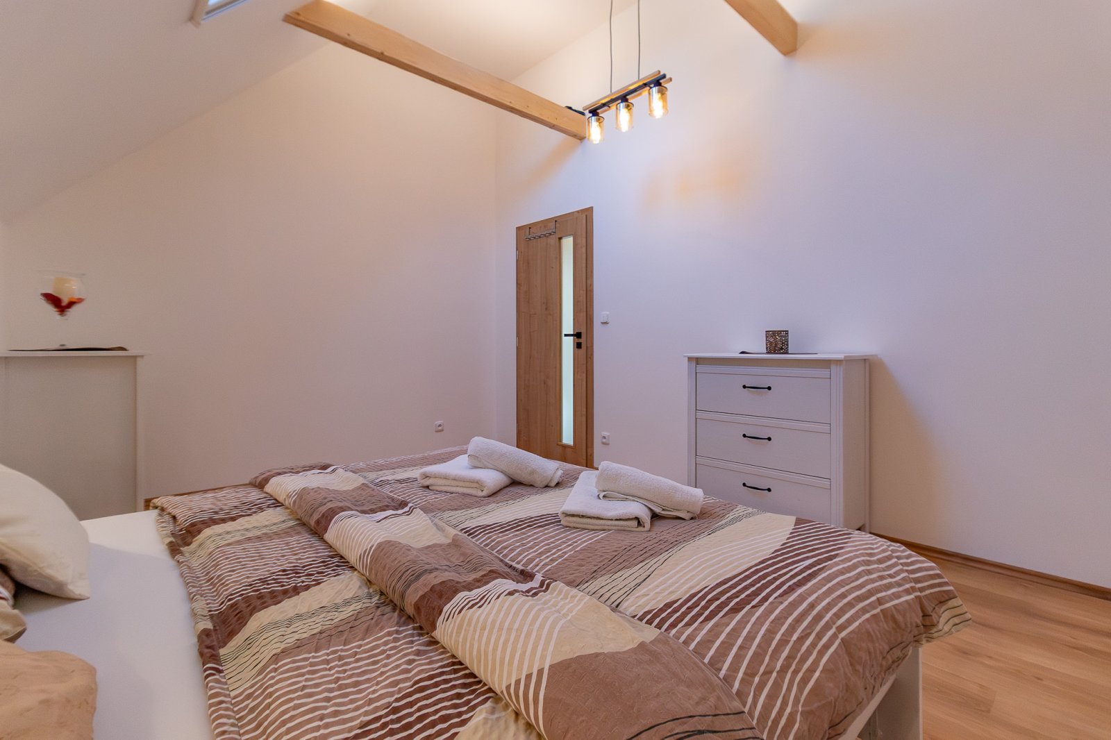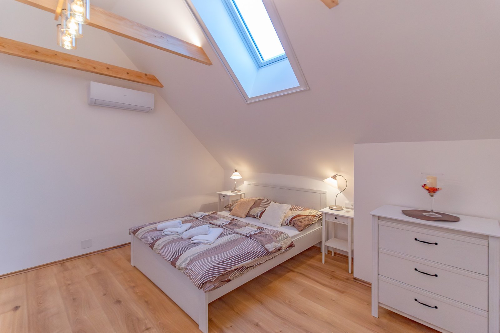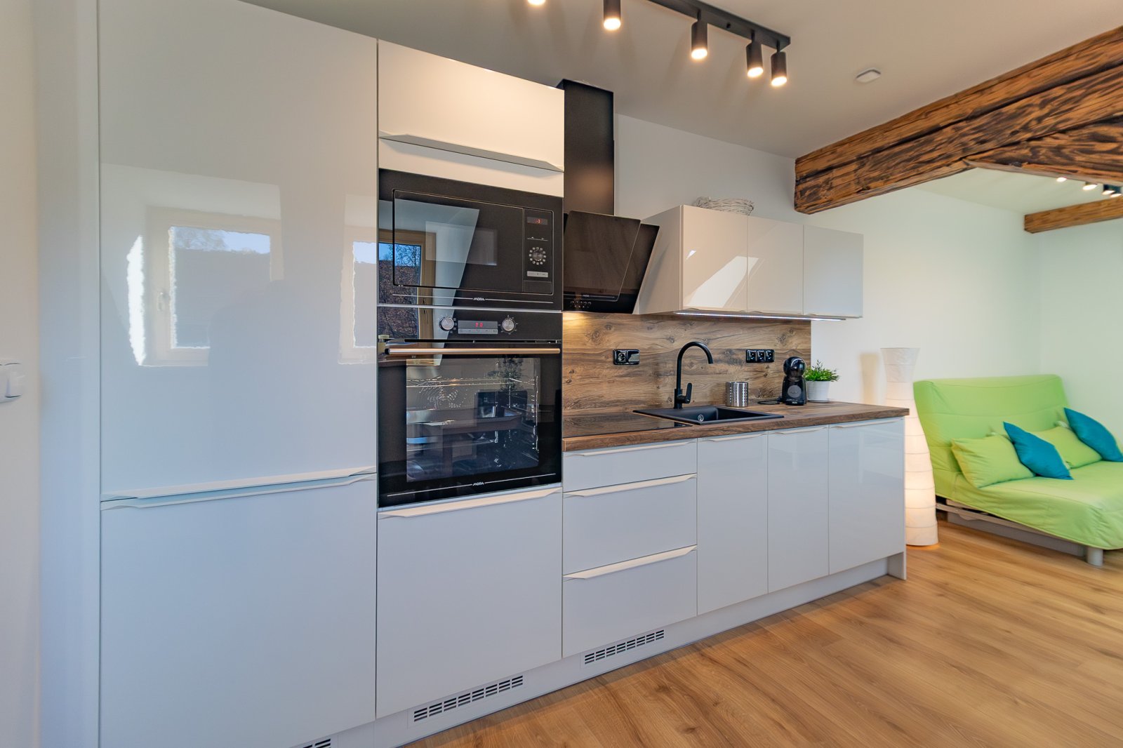 Apartmán č. 4 o podlahové ploše 47,8 m2 s celkovou plochou 67.8m2 je kompletně moderně a vkusně vybavený jak elektrospotřebiči, tak nábytkem. Vnitřní dispozice 2+kk v 1. NP: vstupní předsíň, kuchyňský kout - kuchyňská linka zn. Oresi ( s el. horkovzdušnou troubou s indukční deskou, mikrovlnnou troubou, lednicí s mrazákem zn. Mora). Jídelní koutek s obývacím prostorem včetně nábytku a TV ; ložnice. Koupelna (se sprchovým koutem, umyvadlem, topným žebříkem a připojením k pračce, baterie – Grohe, sanita - Geberit), samostatné WC. V rámci rekonstrukce bylo provedeno zaizolování stropů, položeny protihlukové podlahy, plovoucí podlaha zn. Quick – Step a protihlukové stěny mezi apartmány, okna dřevěná s trojskly. Vytápění je řešeno klimatizací Haier - ovládanou tel., vjezdová brána ovládaná tel. a kódovým systémem, samostatné připojení wifi, kamerový systém. K bytu náleží vlastní venkovní prostor k posezení, kój (5m2), jedno parkovací stání u domu a společné venkovní prostory k odpočinku. Voda čerpána z vrtané studny, odpad řešen ČOV. V rezidenci je dále k dispozici využití sauny a fitness.
