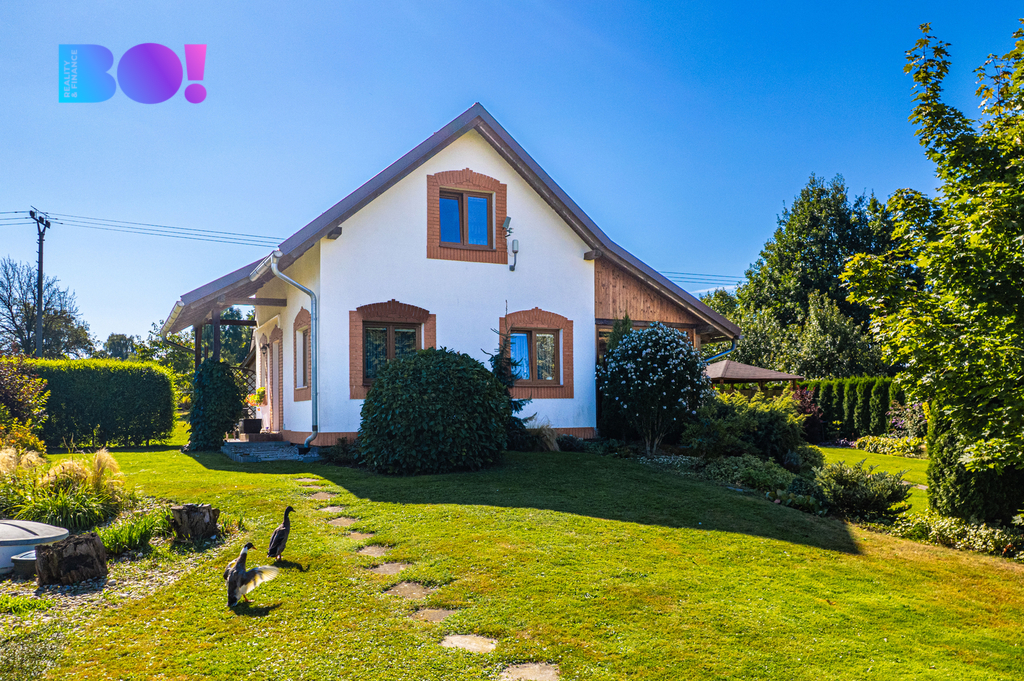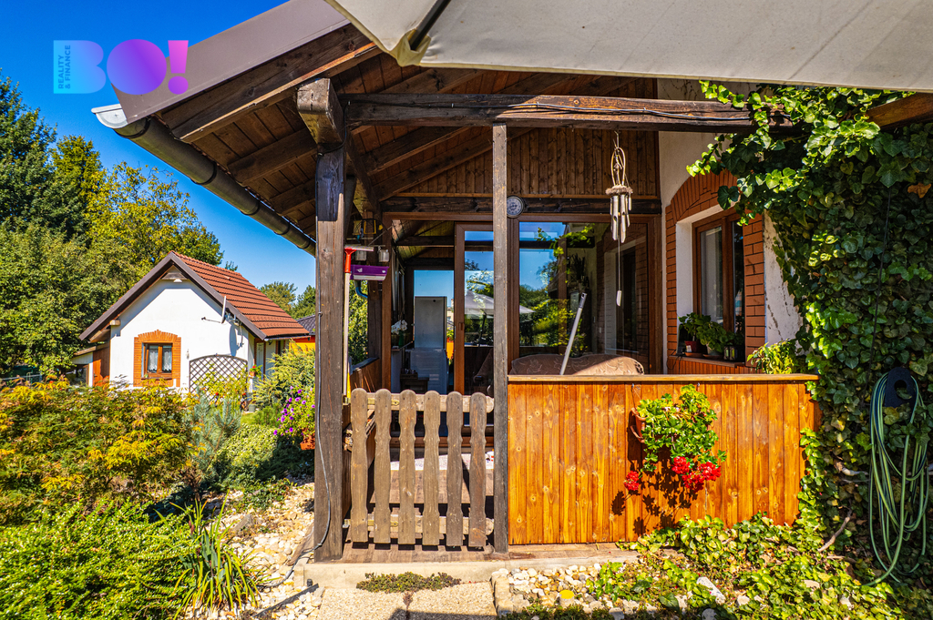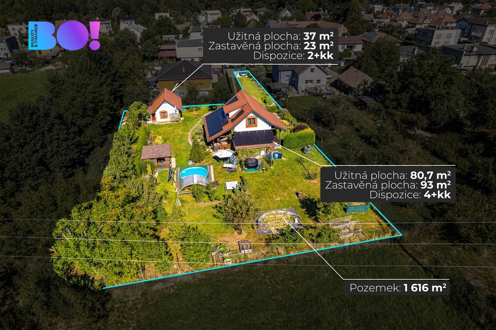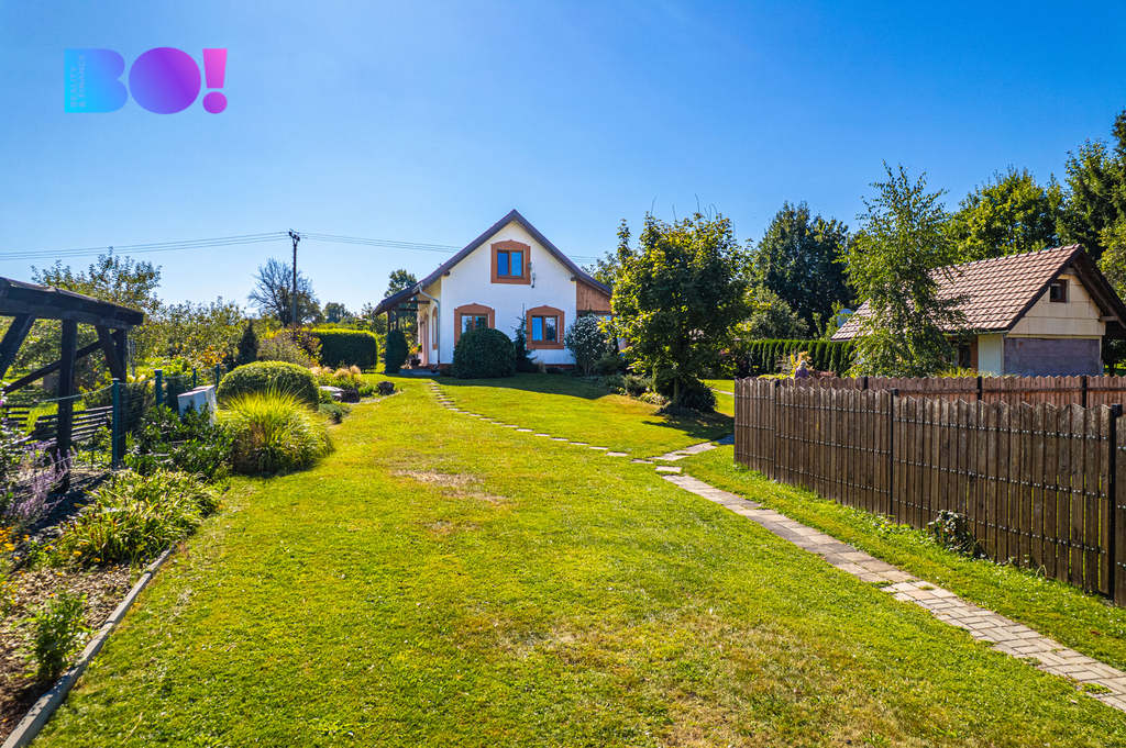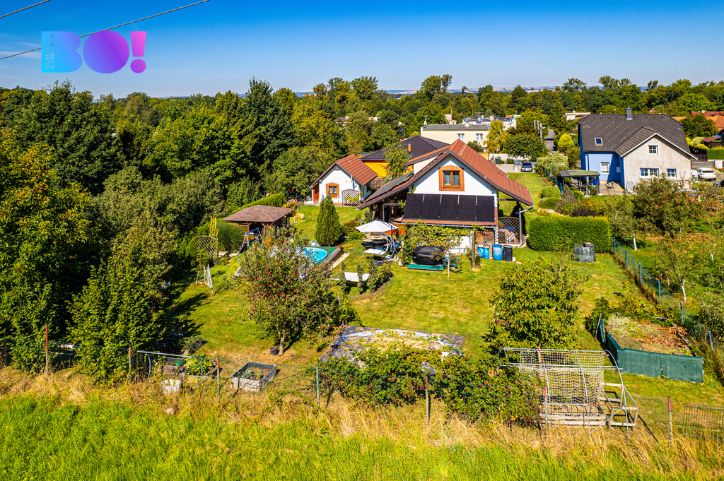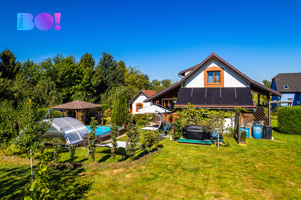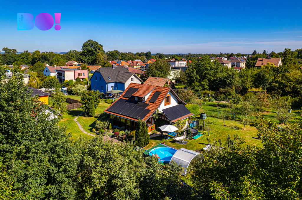 Nabízíme středně velký moderně stavěný cihlový rodinný dům s fotovoltaikou s nádherně upravenou zahradou s altánkem, krytým bazénem a druhým menším domem v rohu zahrady.