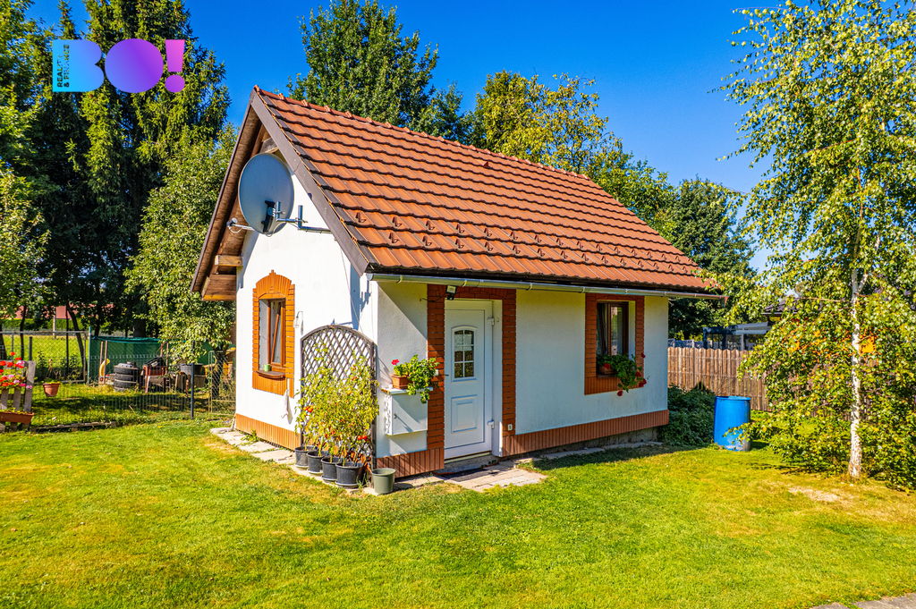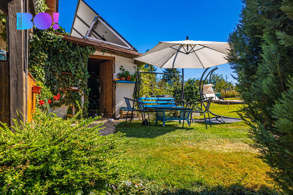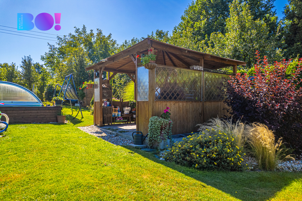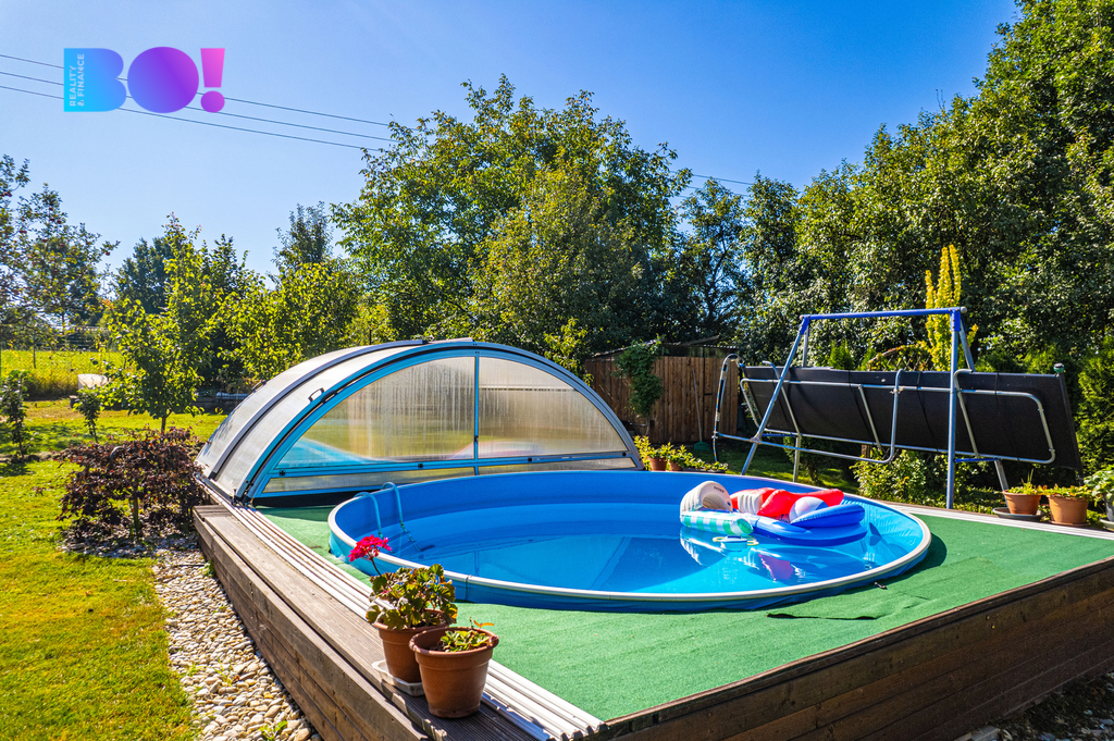 Opečovávaná zahrada s ovocnými keři a stromy má okrasnou, užitkovou a odpočinkovou část s krytým bazénem a s altánek dovolující posezení ve stínu. Zděný domek v rohu zahrady může po dokončení sloužit k celoročnímu bydlení anebo ihned pro podnikání v drobných službách.