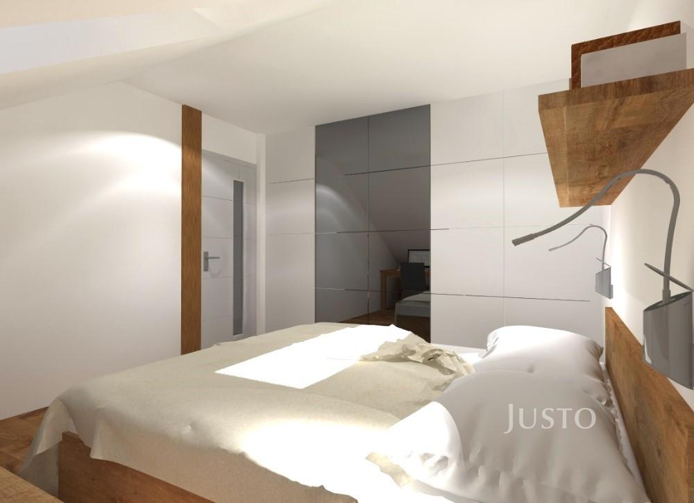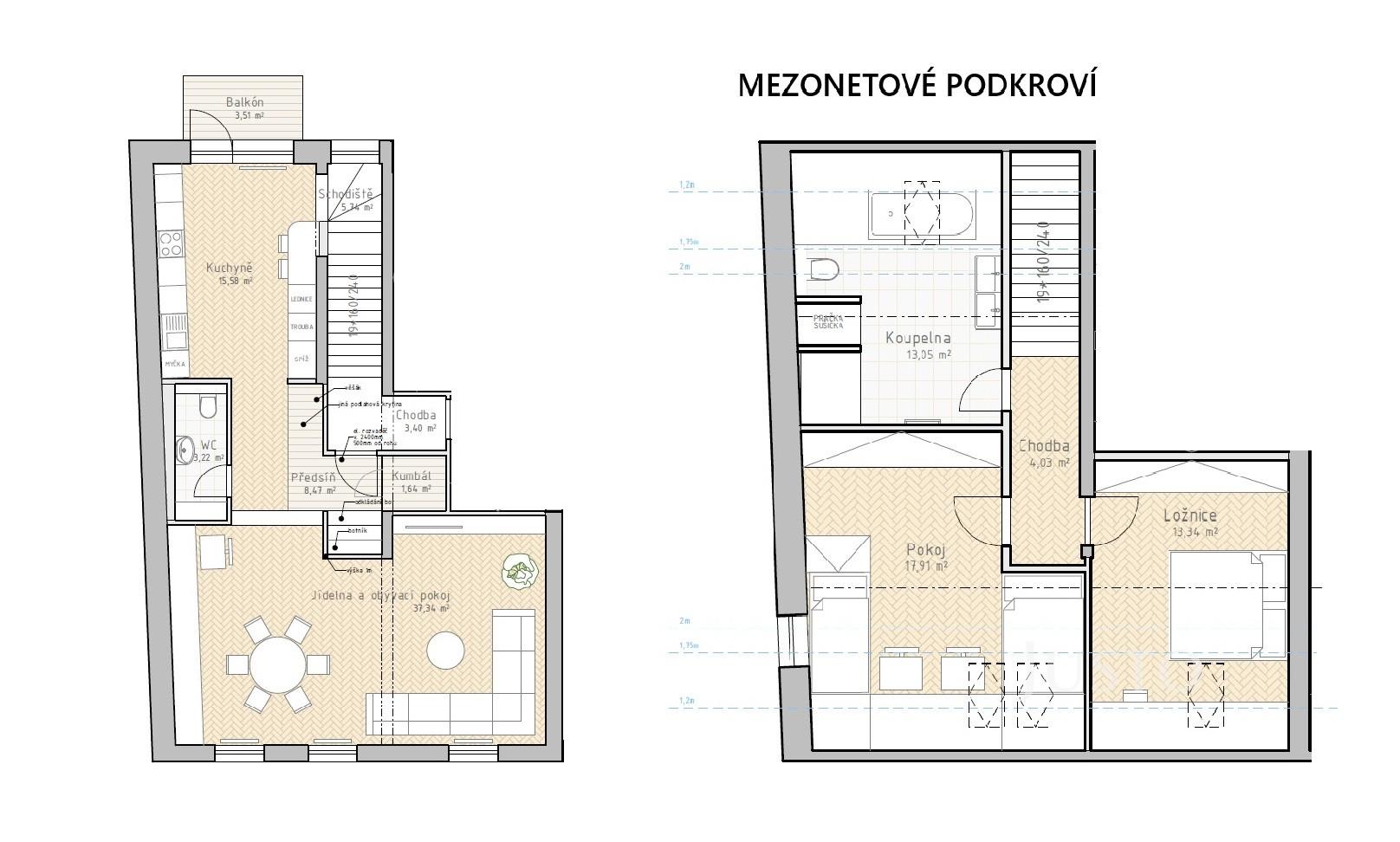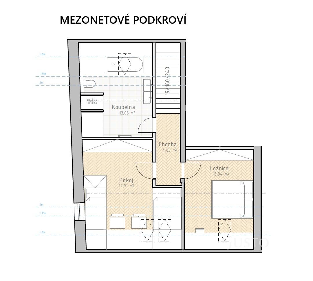 V horním podlaží se nachází klidová zóna bytu – dvě ložnice a prostorná koupelna vybavená vanou, sprchovým koutem, toaletou a místem pro pračku i sušičku.