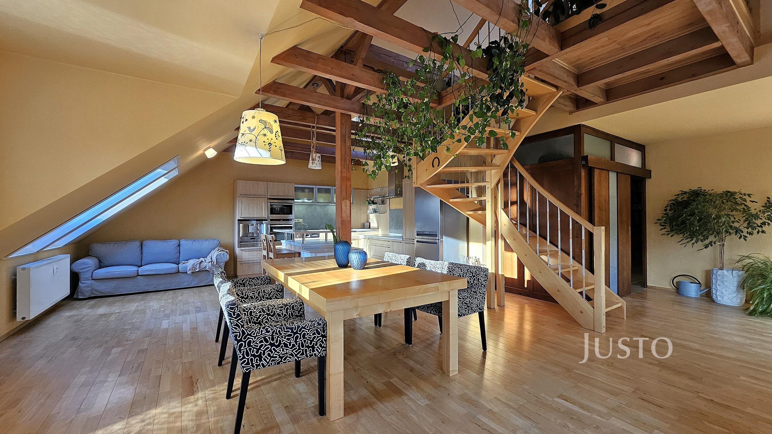 Byt působí velmi reprezentativně, vzdušně a harmonicky – je skvělou volbou pro ty, kteří hledají alternativu k rodinnému domu v centru města.