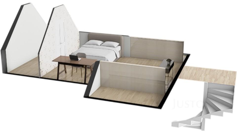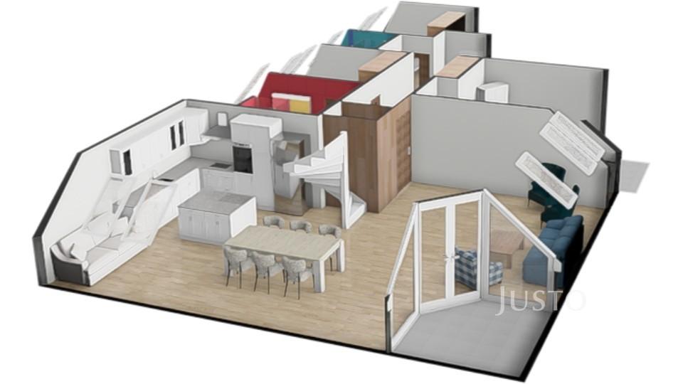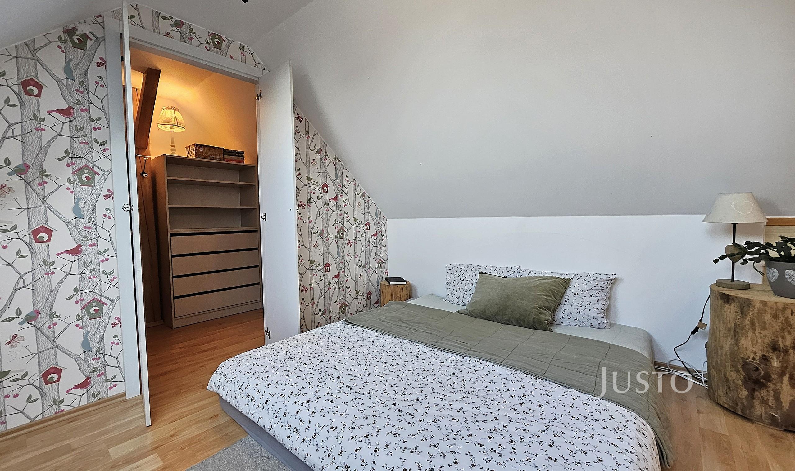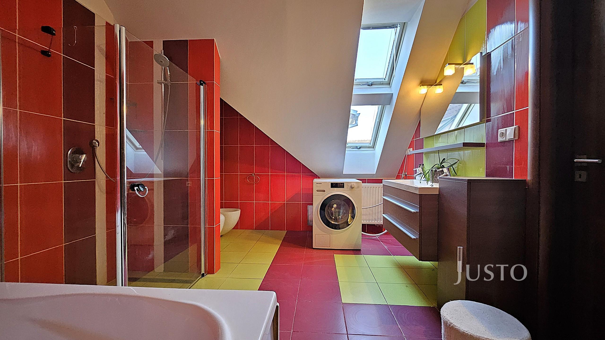 Dominantou bytu je reprezentativní obývací pokoj s jídelní částí a kuchyňským koutem, který tvoří přirozené srdce domova. Z obývacího pokoje vede elegantní schodiště do mezonetu, kde se nachází samostatná ložnice se šatnou – ideální jako rodičovská zóna, pracovna nebo pokoj pro hosty.