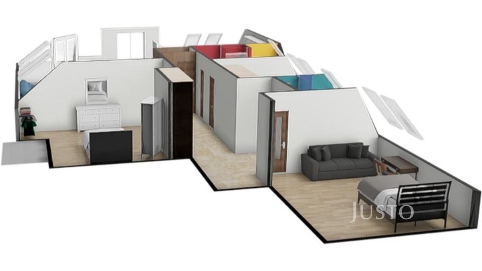 V přízemí se nachází tři samostatné ložnice, každá s vlastním vstupem, což zajišťuje maximální soukromí. Jedna z ložnic je přímo propojena s prostornou koupelnou. Další velkou výhodou jsou dvě koupelny a dva balkony, které ještě více podtrhují komfort tohoto bytu.