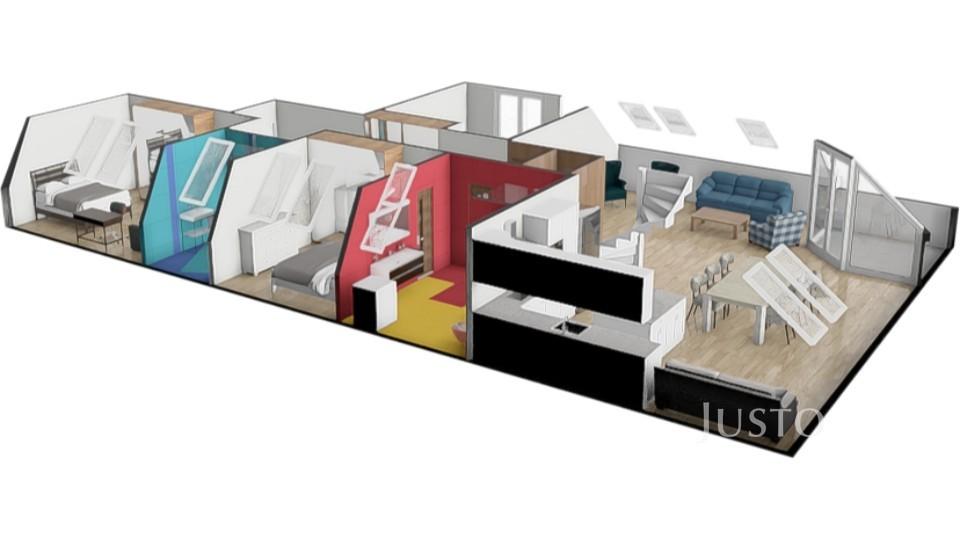 Tento byt představuje ideální kombinaci městského bydlení a komfortu rodinného domu – soukromí, velkorysé prostory, promyšlená dispozice a dostatek ložnic i úložných prostor uspokojí i náročnou rodinu.