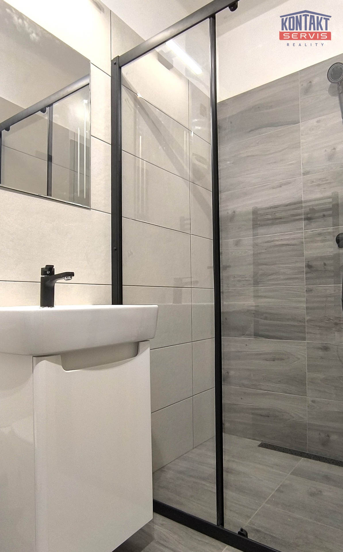 • moderní koupelna se sprchovým koutem, toaletou a topným žebříkem