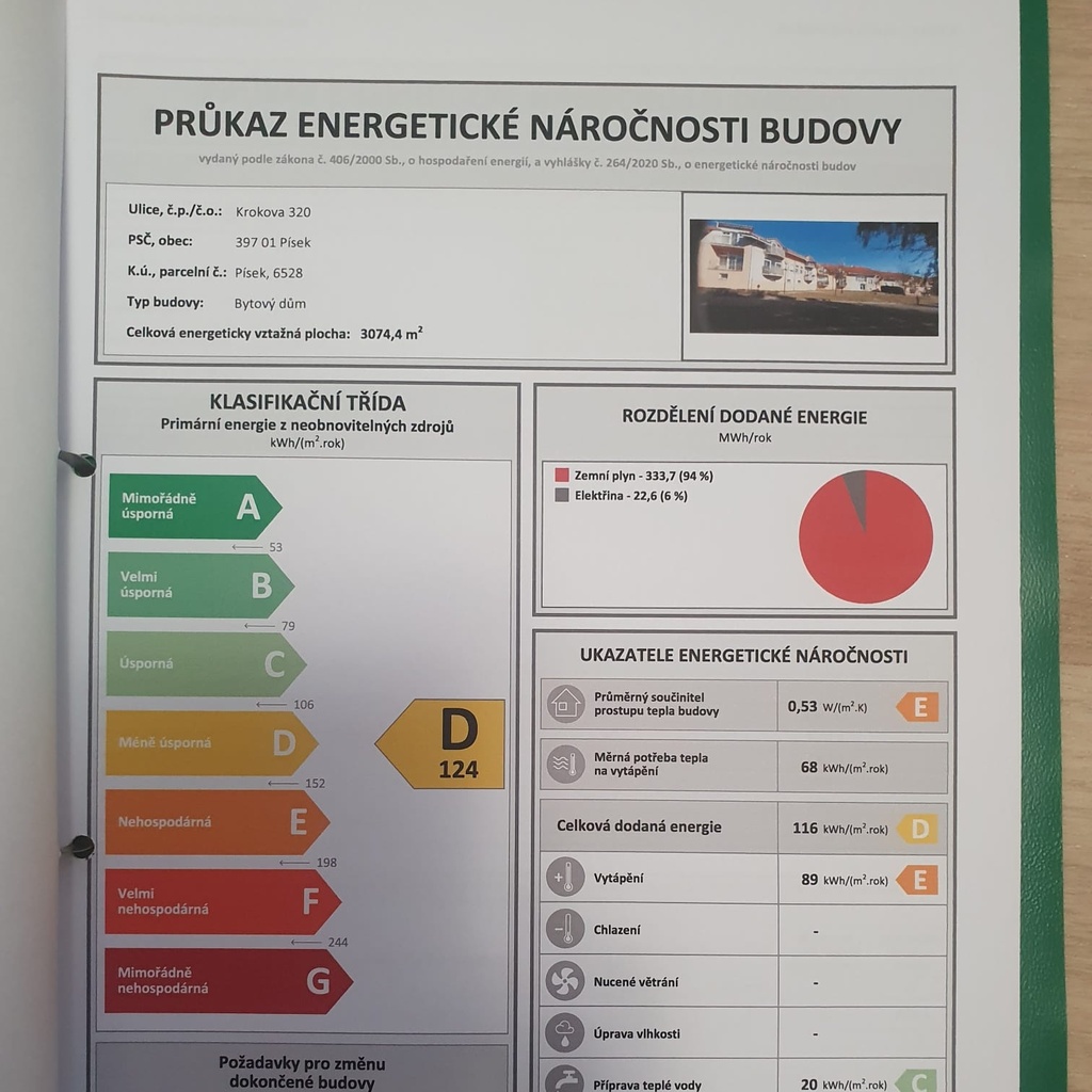 Ukazatel energetické náročnosti budovy:124 kWh/m²
