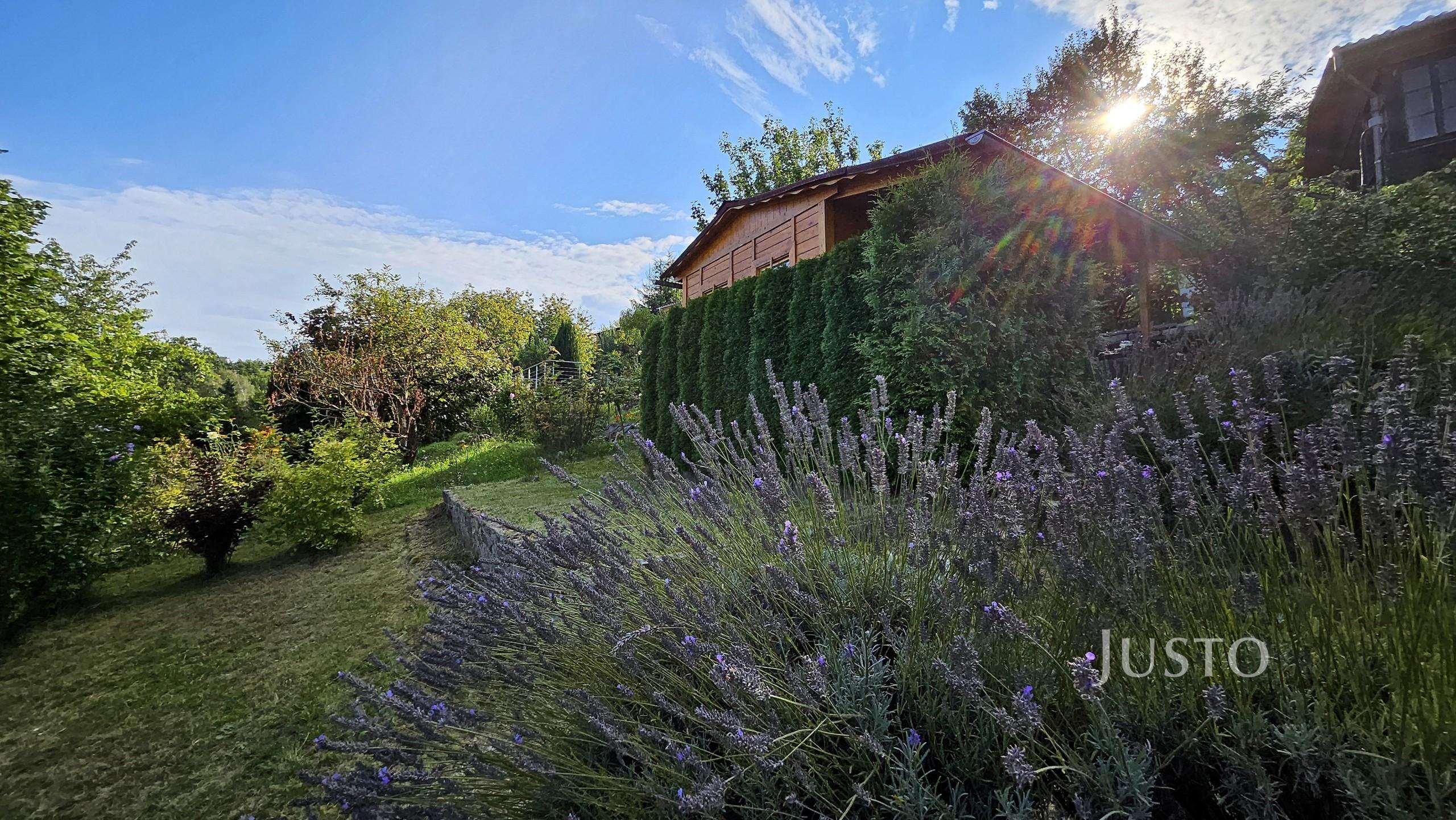 Pozemek je velmi pěkný, sice mírně svažitý, ale jsou zde terásky osázeny levandulemi a dalšími okrasnými květinami a keři.