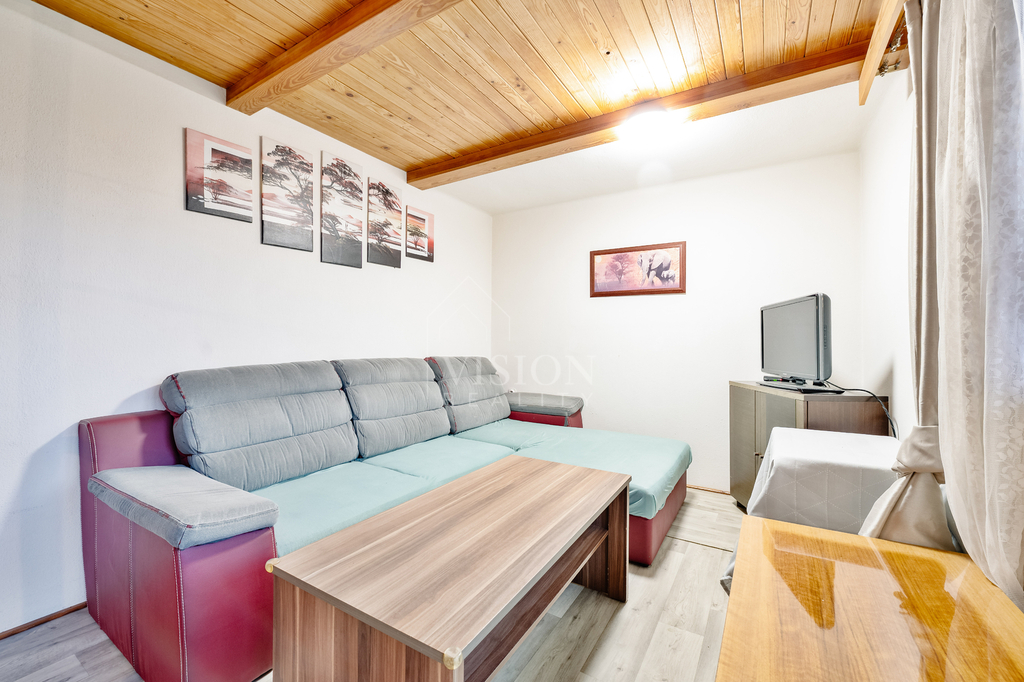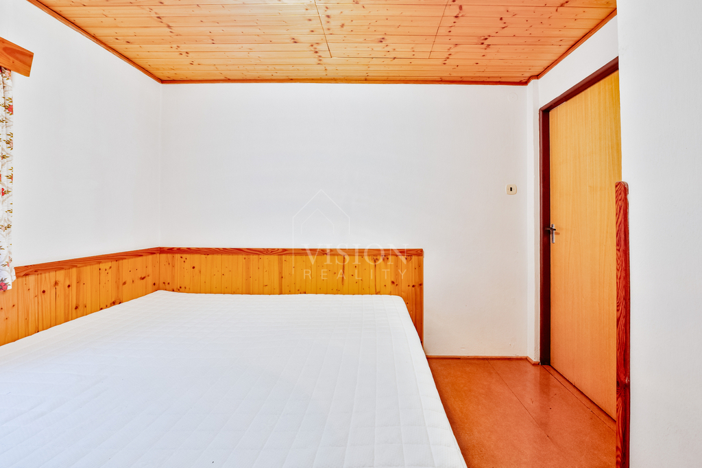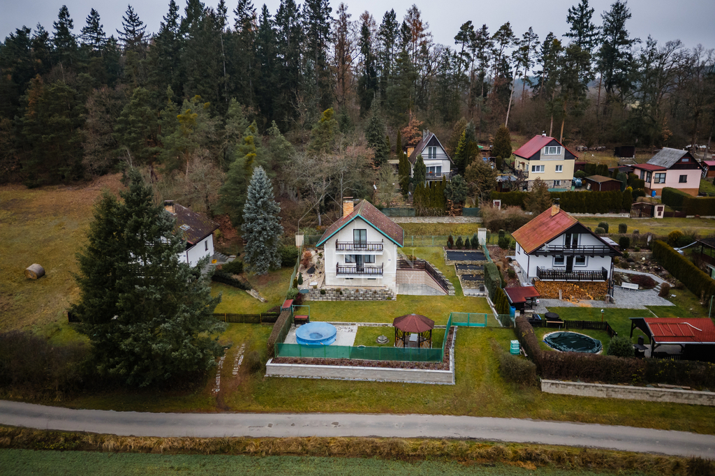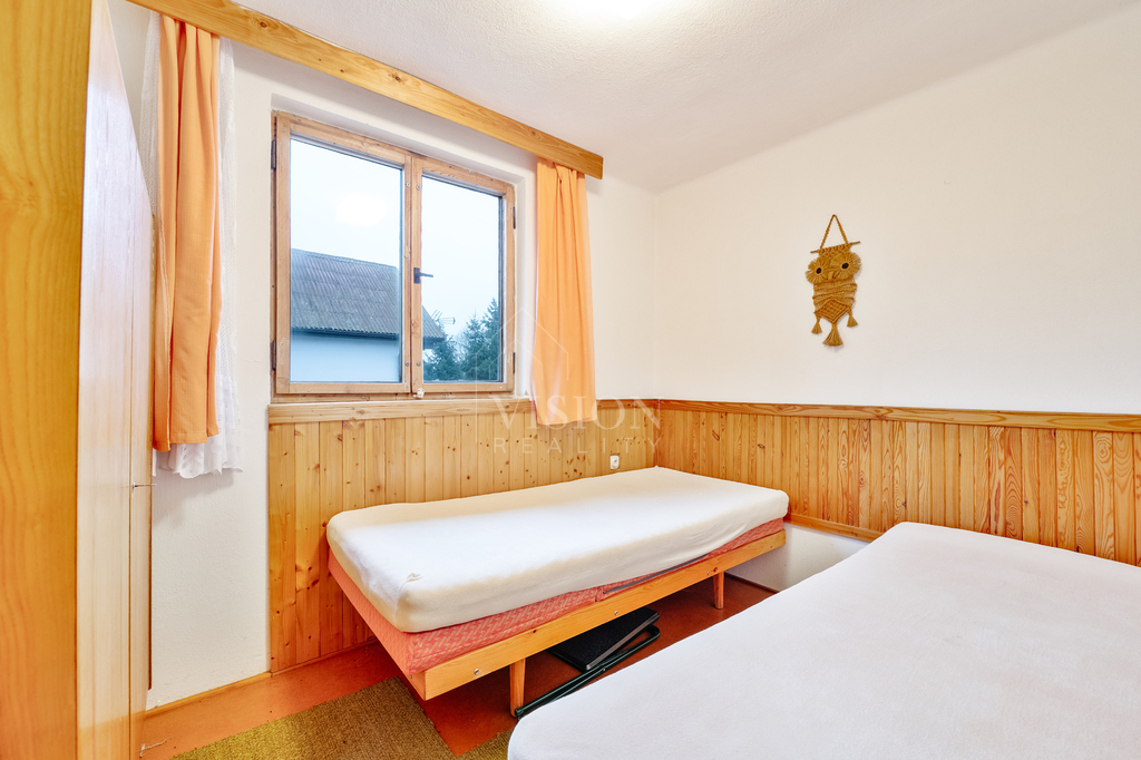 V prvním nadzemním podlaží se nachází ložnice, obývací pokoj, kuchyně a koupelna. Druhé podlaží nabízí dva dětské pokoje a další ložnici – ideální rozložení pro rodinu i pravidelné víkendové pobyty.