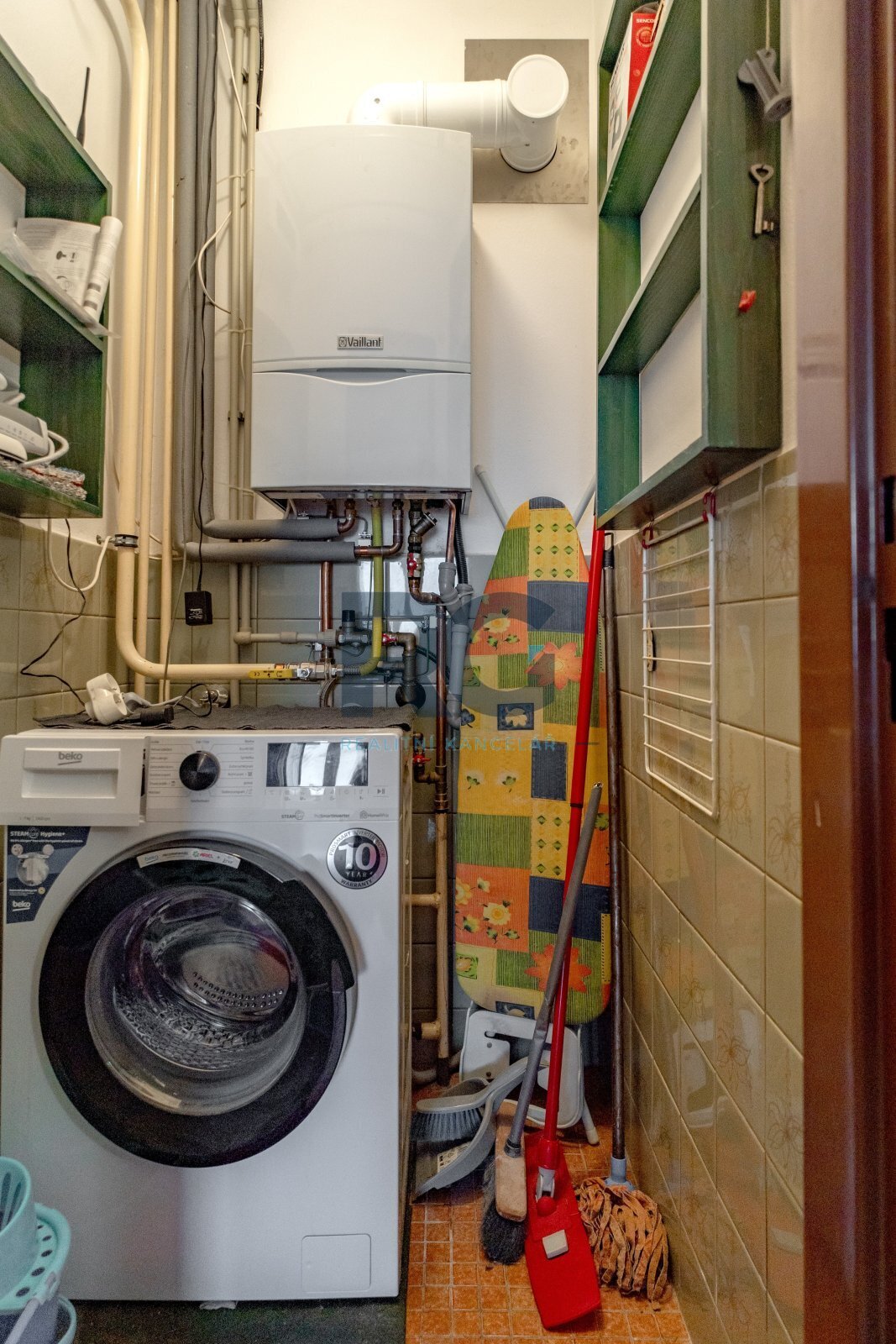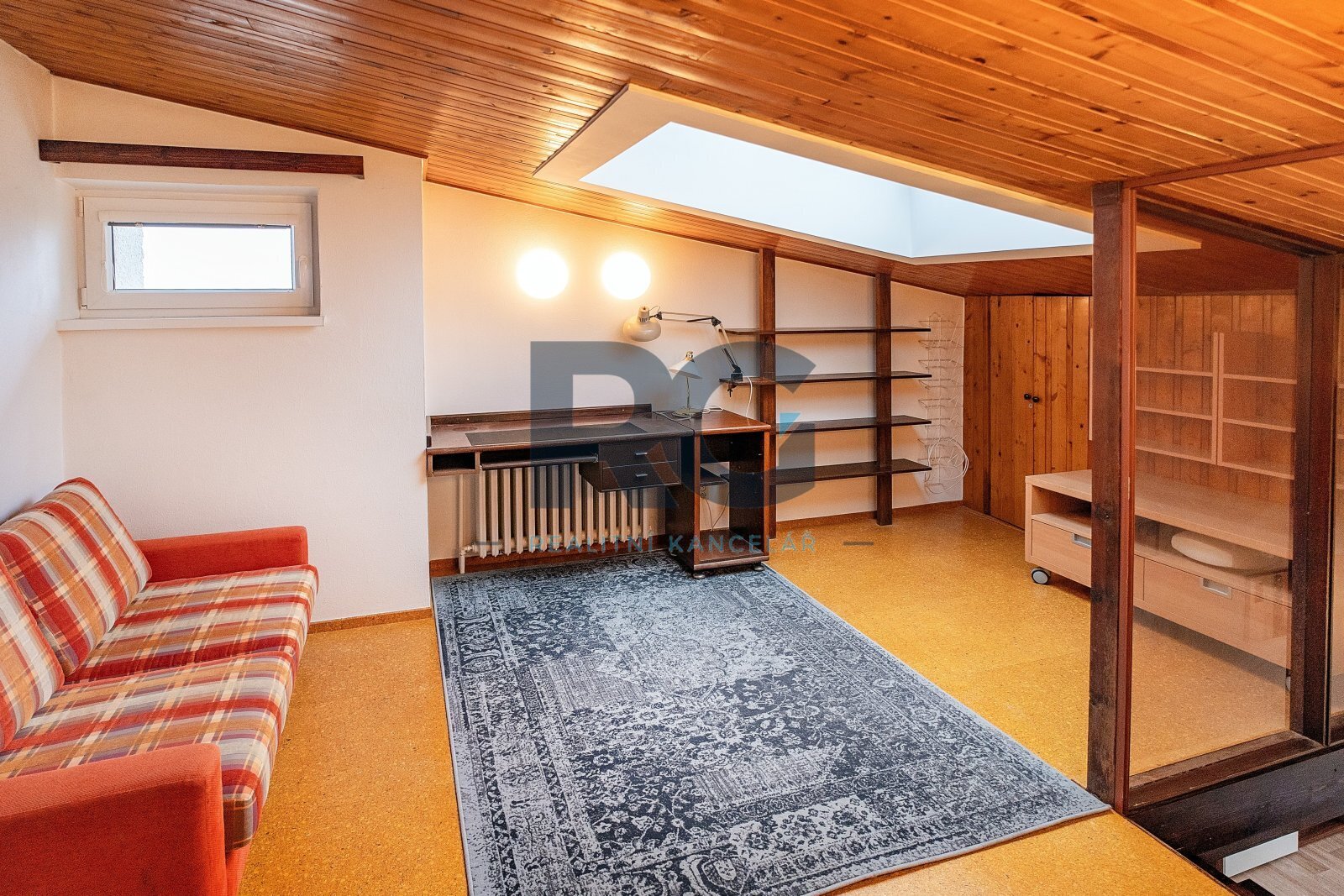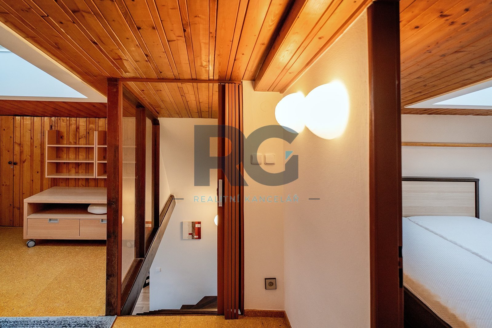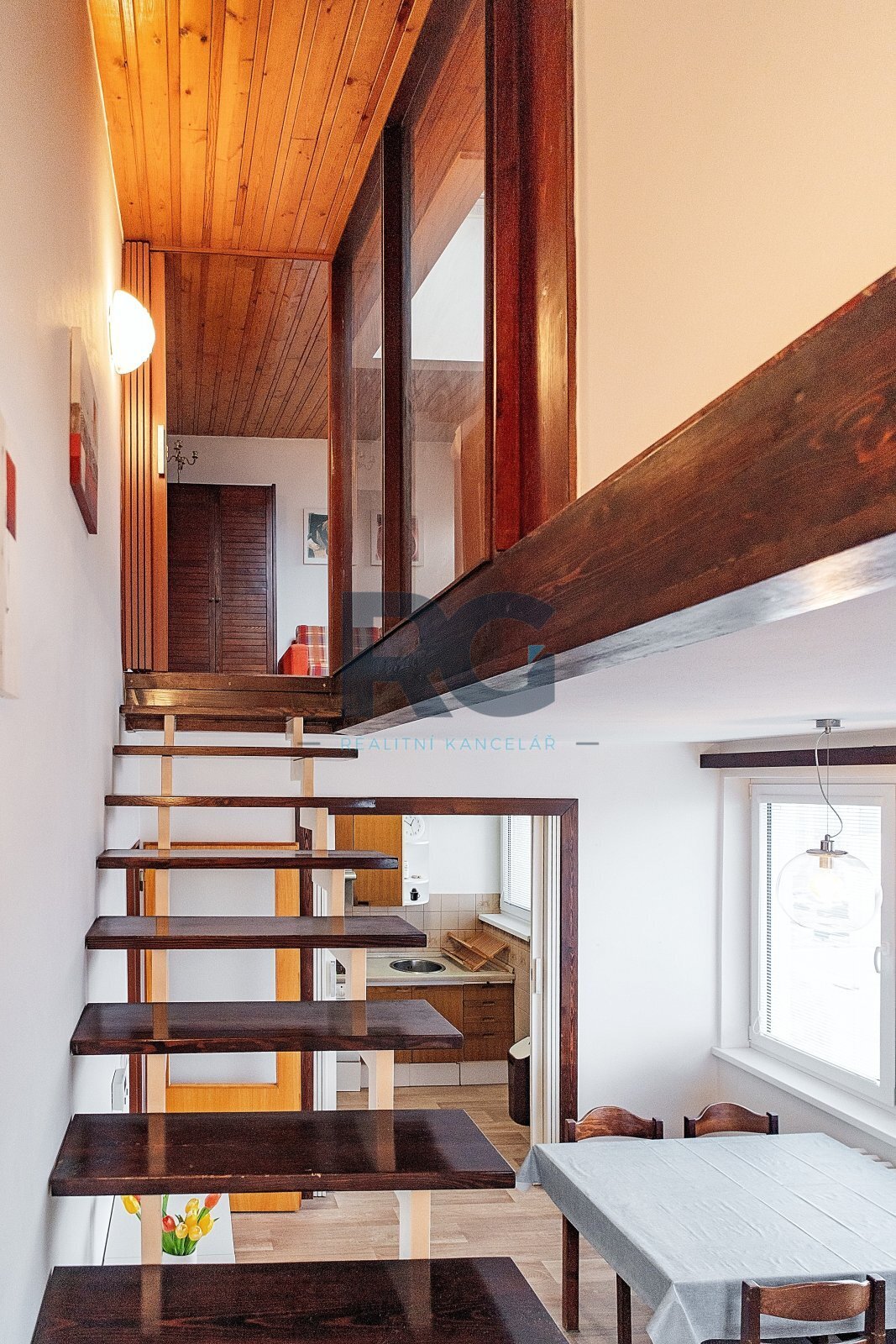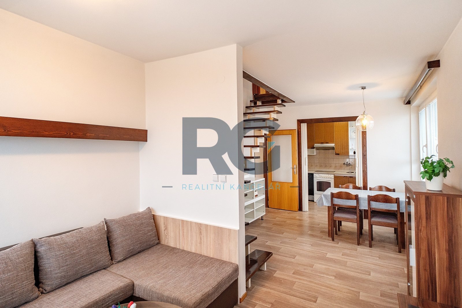 V přízemí bytu se nachází obývací pokoj s jídelnou, kuchyně, ložnice se vstupem na balkon a dětský pokoj. Každý pokoj má samostatný vstup z chodby, žádný pokoj není průchozí. Dále je zde k dispozici technická místnost, ve které je umístěn plynový kotel a je zde místo pro pračku, koupelna s vanou a samostatná toaleta. Podkroví bytu nabízí pracovnu a jeden pokoj s vlastní koupelnou, ve které je sprchový kout. Byt je vybaven kuchyňskou linkou včetně spotřebičů (elektrická trouba, varná deska, mikrovlnná trouba, digestoř, myčka nádobí, lednice s mrazákem). Veškeré vybavení bytu je možné ponechat. Vytápění a ohřev vody je zajištěn vlastním plynovým kondenzačním kotlem.