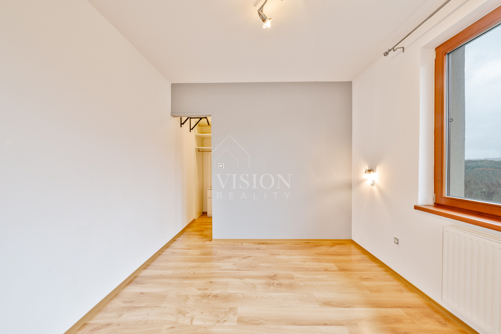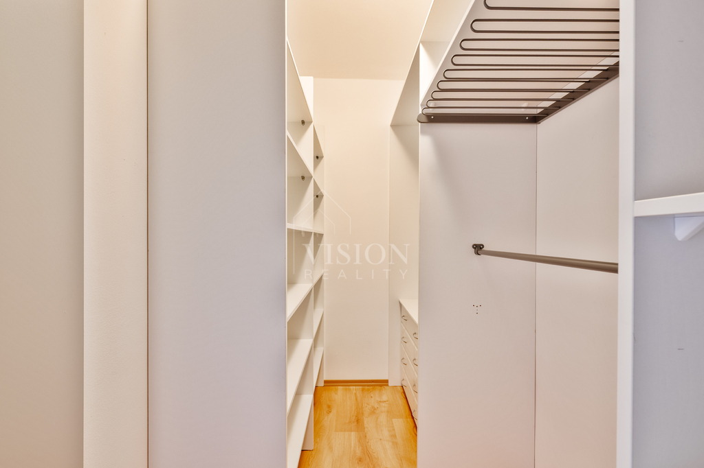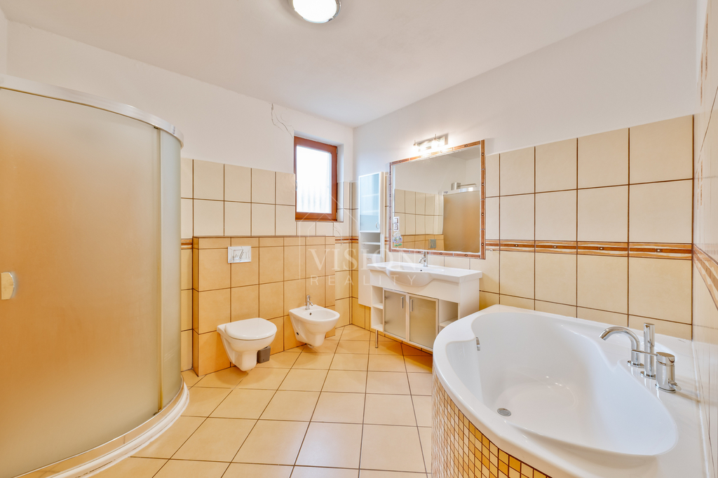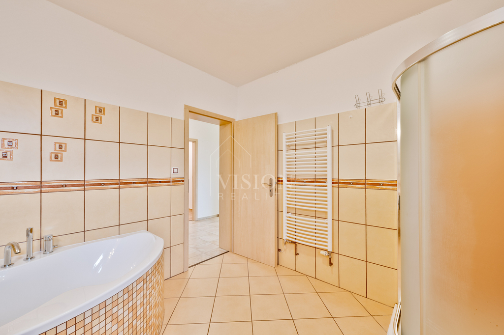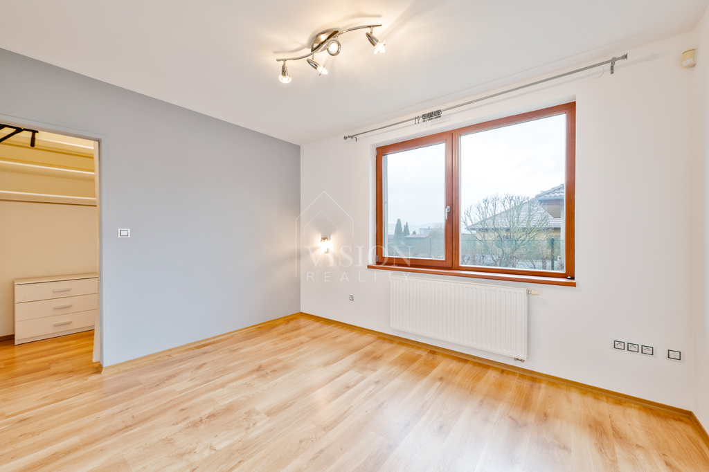 Hlavní ložnice a jeden dětský pokoj sdílejí společnou průchozí šatnu, což výrazně zvyšuje komfort bydlení. Druhý dětský pokoj má vlastní samostatnou šatnu. Součástí dispozice je také menší pracovna ideální pro home-office, praktická spíž u kuchyně, technická místnost, koupelna vybavená vanou, sprchovým koutem a WC a dále samostatné WC.