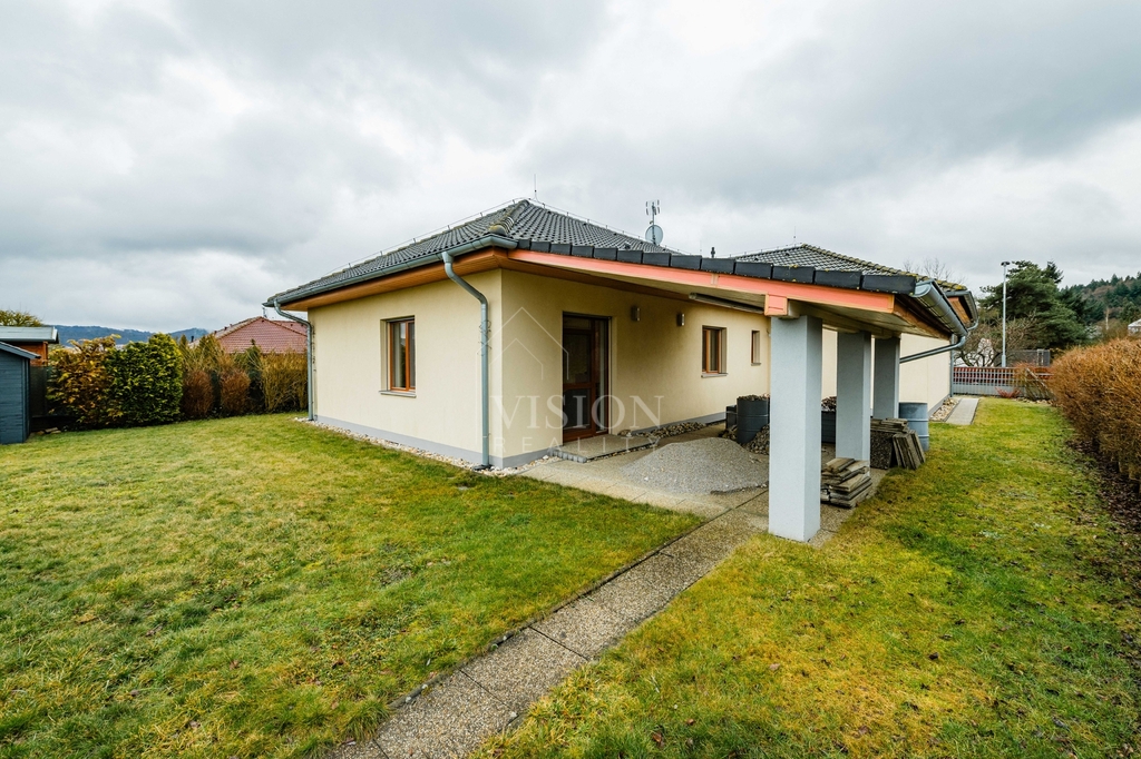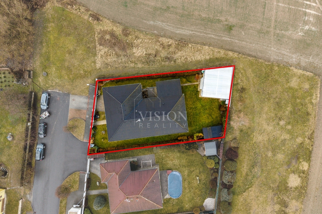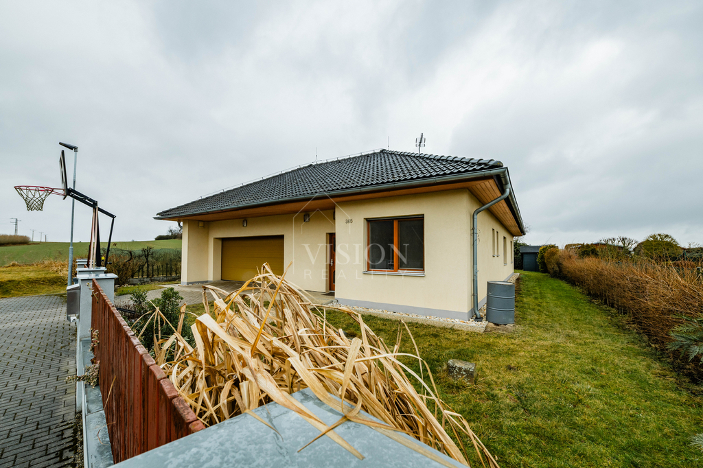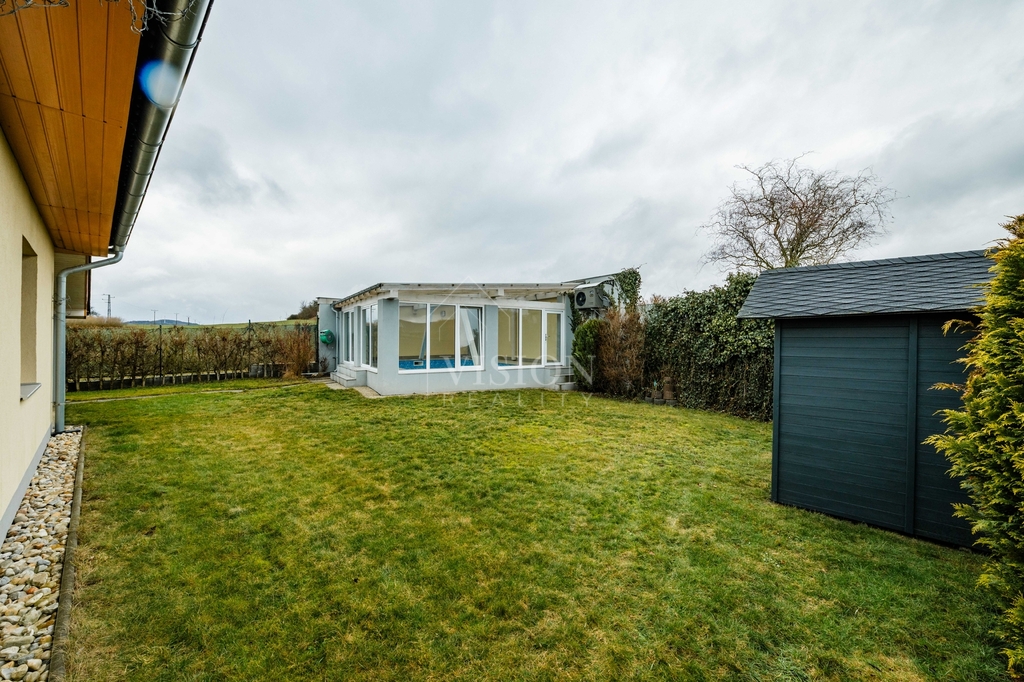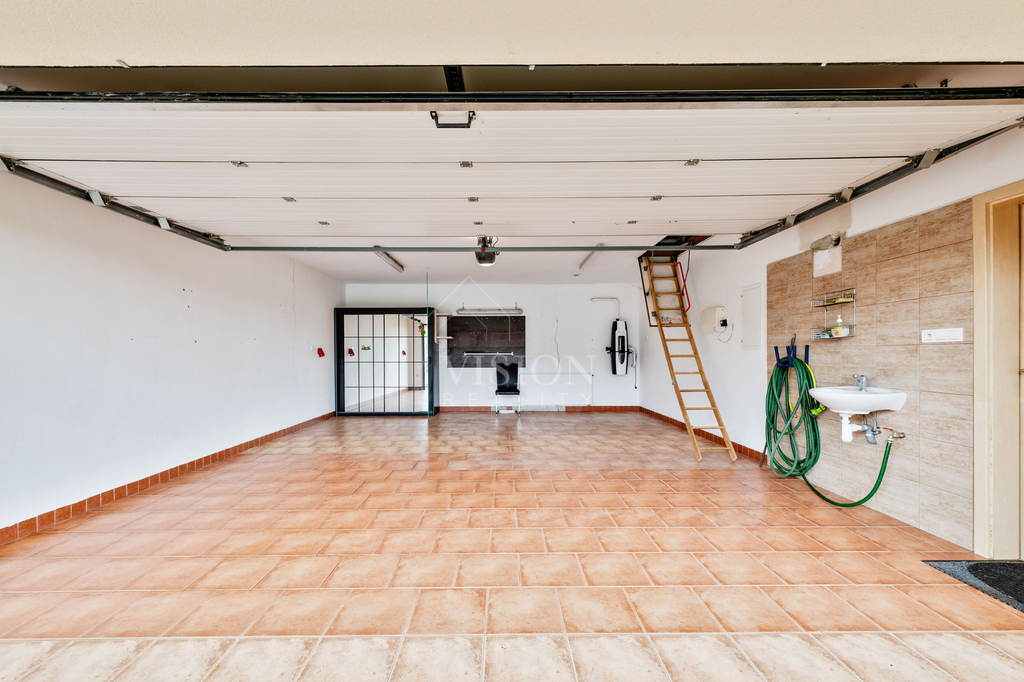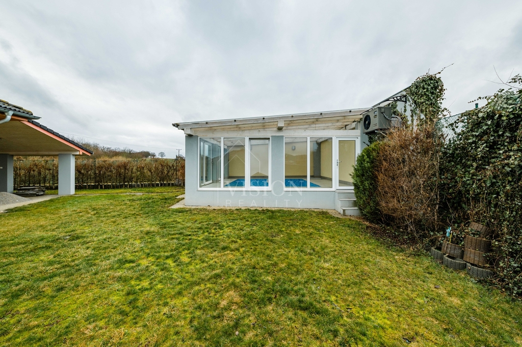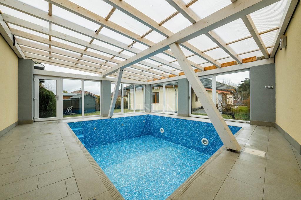 Součástí domu je prostorná dvougaráž integrovaná přímo v objektu. Z obývacího pokoje je přímý vstup na zastřešenou terasu, která nabízí příjemné posezení a dostatek soukromí. Na zahradě se nachází zastřešený bazén, jenž prodlužuje koupací sezónu od jara až do podzimu a vytváří ideální zázemí pro rodinnou relaxaci.