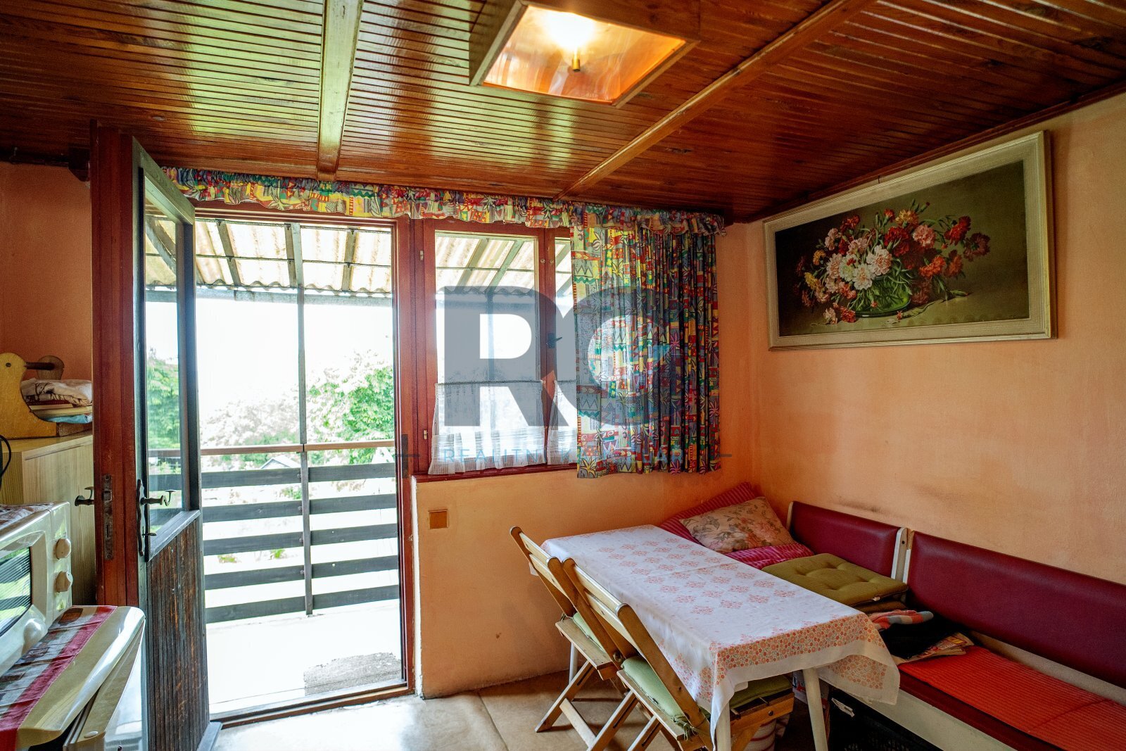 V přízemí chaty se nachází obytný prostor s kuchyňským koutem se vstupem na balkon, ze kterého je pěkný výhled na město Písek. Dále je zde schodiště do podkroví, které slouží jako ložnice pro spaní.