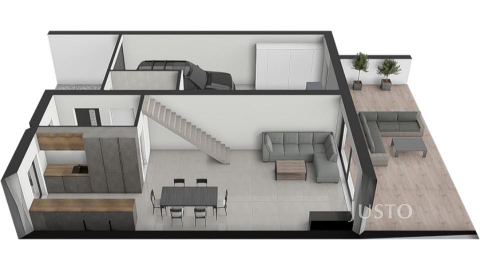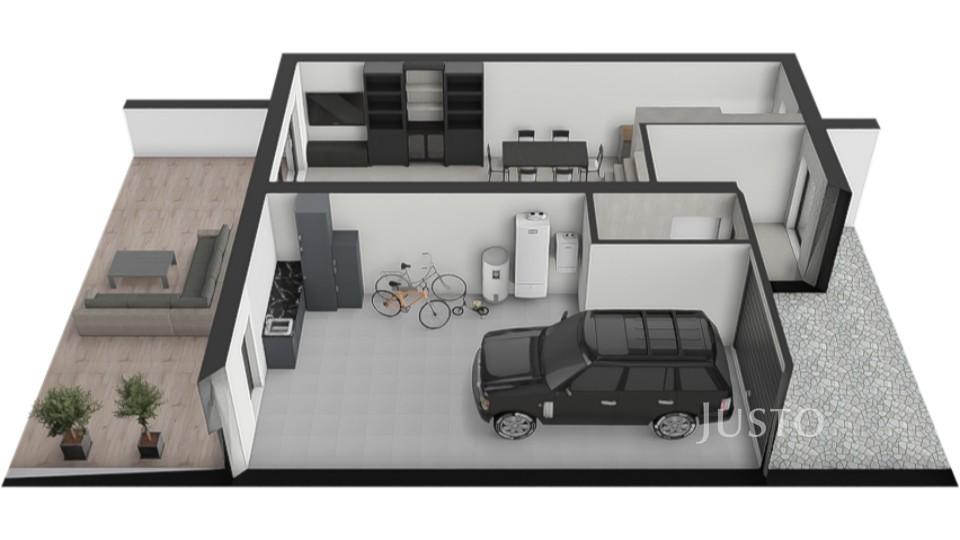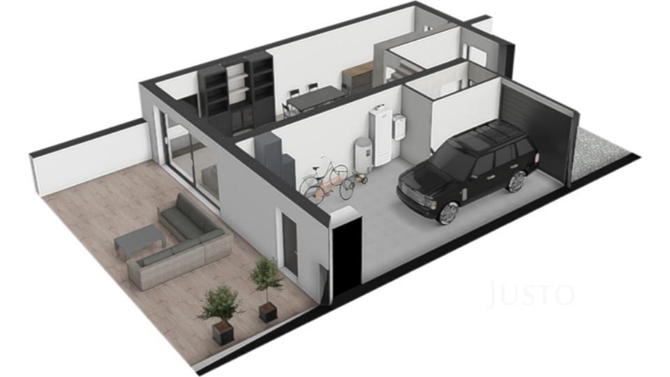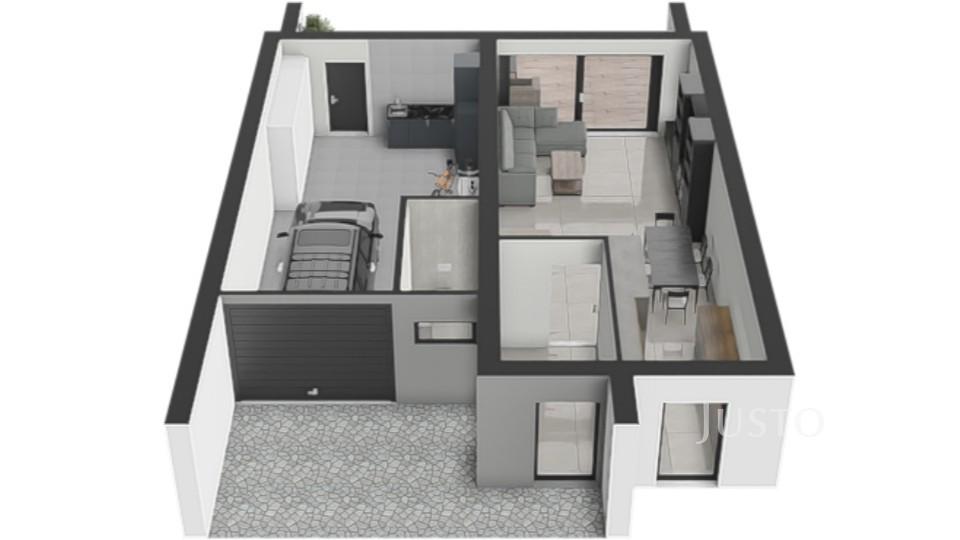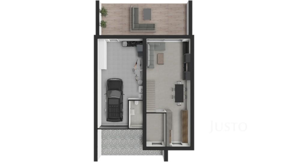 V přízemí najdete velkorysý obývací pokoj s kuchyňským koutem o výměře 42,3 m², odkud je přímý vstup na prostornou terasu a zahradu (254 m²). Součástí přízemí je také samostatná toaleta a vstup do dvojgaráže o výměře 36,1 m², ve které se nachází technické zázemí domu.