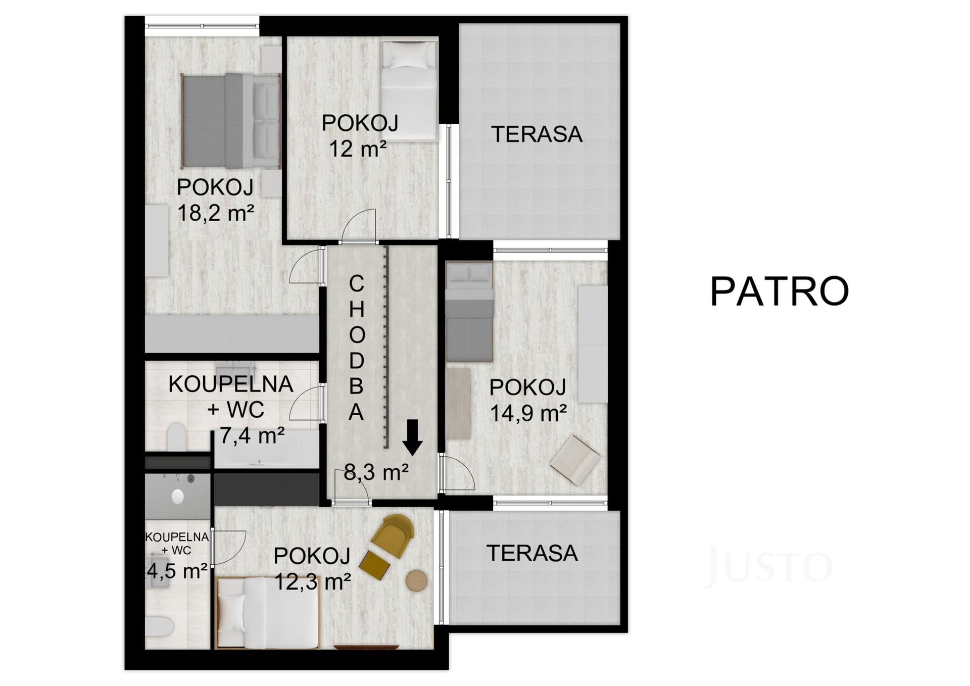 V patře jsou situovány čtyři ložnice, z nichž jedna z ložnice má svou vlastní koupelnu. Pro ostatní pokoje je k dispozici společná koupelna s vanou, sprchovým koutem a toaletou.