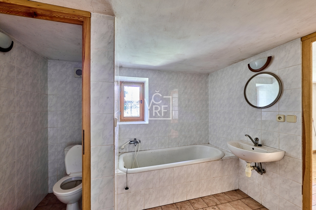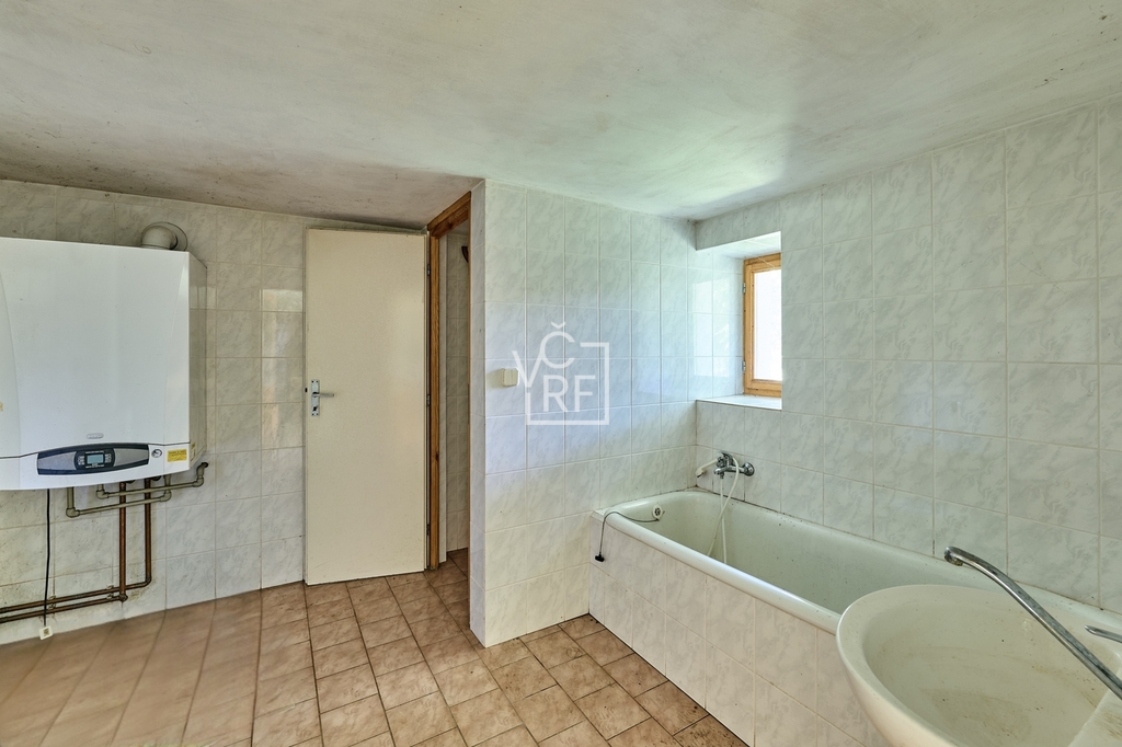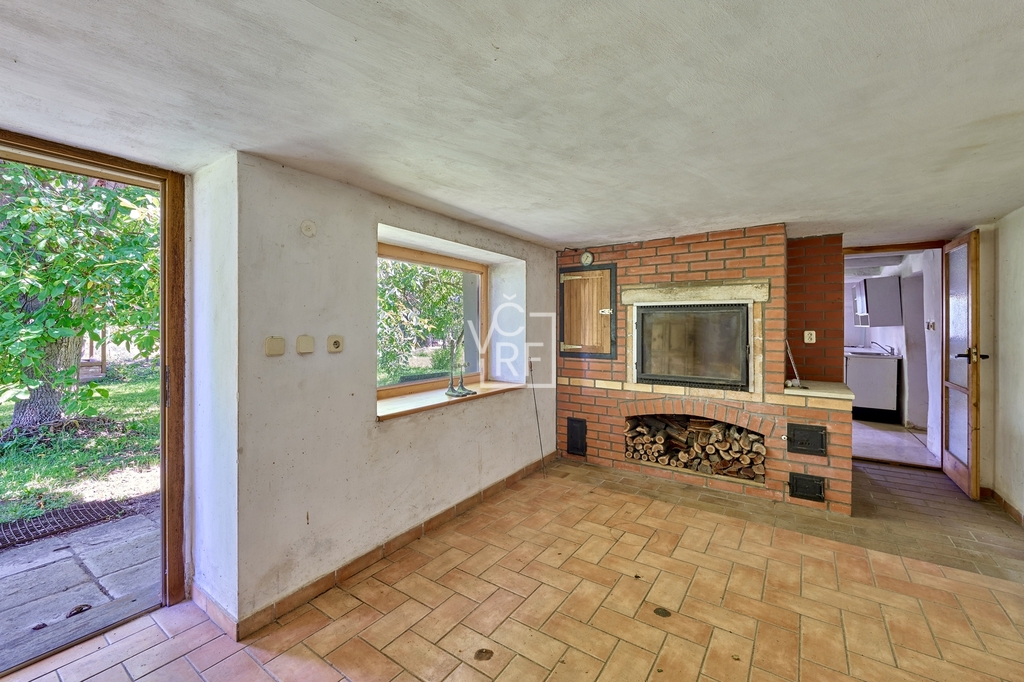 kuchyň, obývací místnost s krbem , koupelna s vanou a oddělené WC