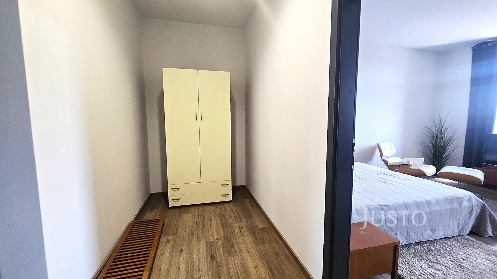 Vybavení bytu, postel, šatní skříň, konferenční stolek, televize, stůl, židle. Díky vybavení a dispozici je ideální pro jednotlivce, kteří hledají komfortní a moderní bydlení bez nutnosti dalších investic.