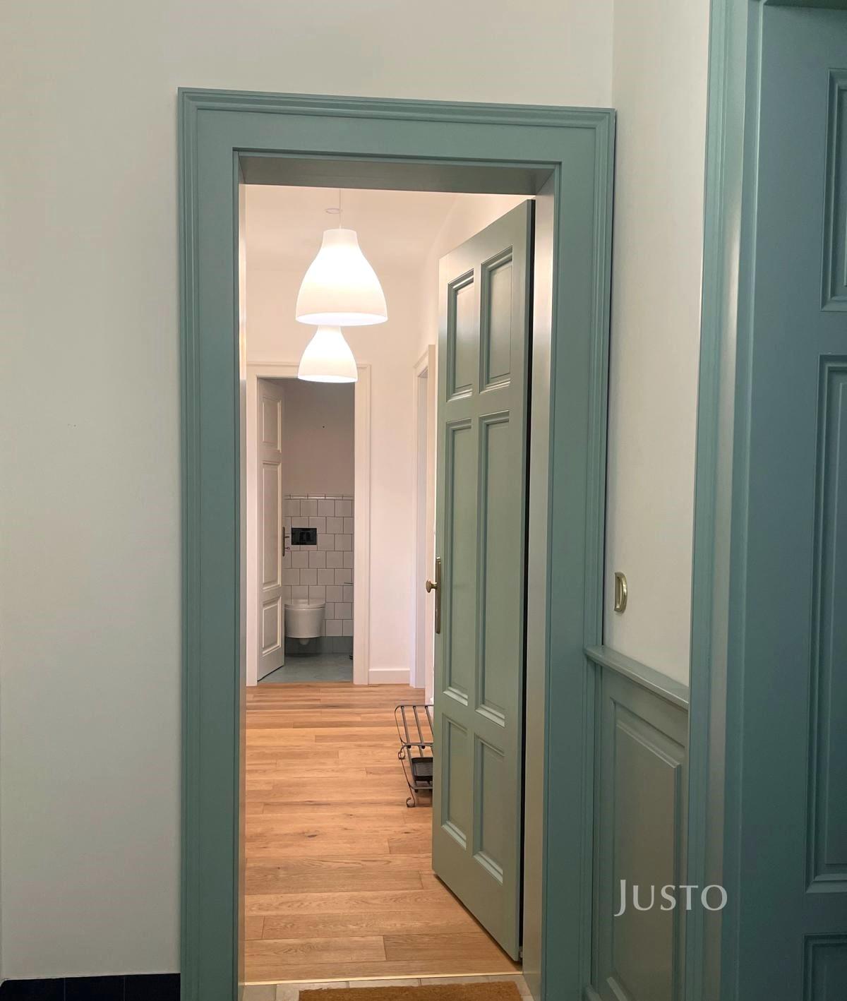 Charakter bydlení podtrhují velkorysé repliky původních prvorepublikových dveří, dřevěná podlaha, dobová koupelna se separátním WC i nová kuchyňská linka s vestavnými spotřebiči.