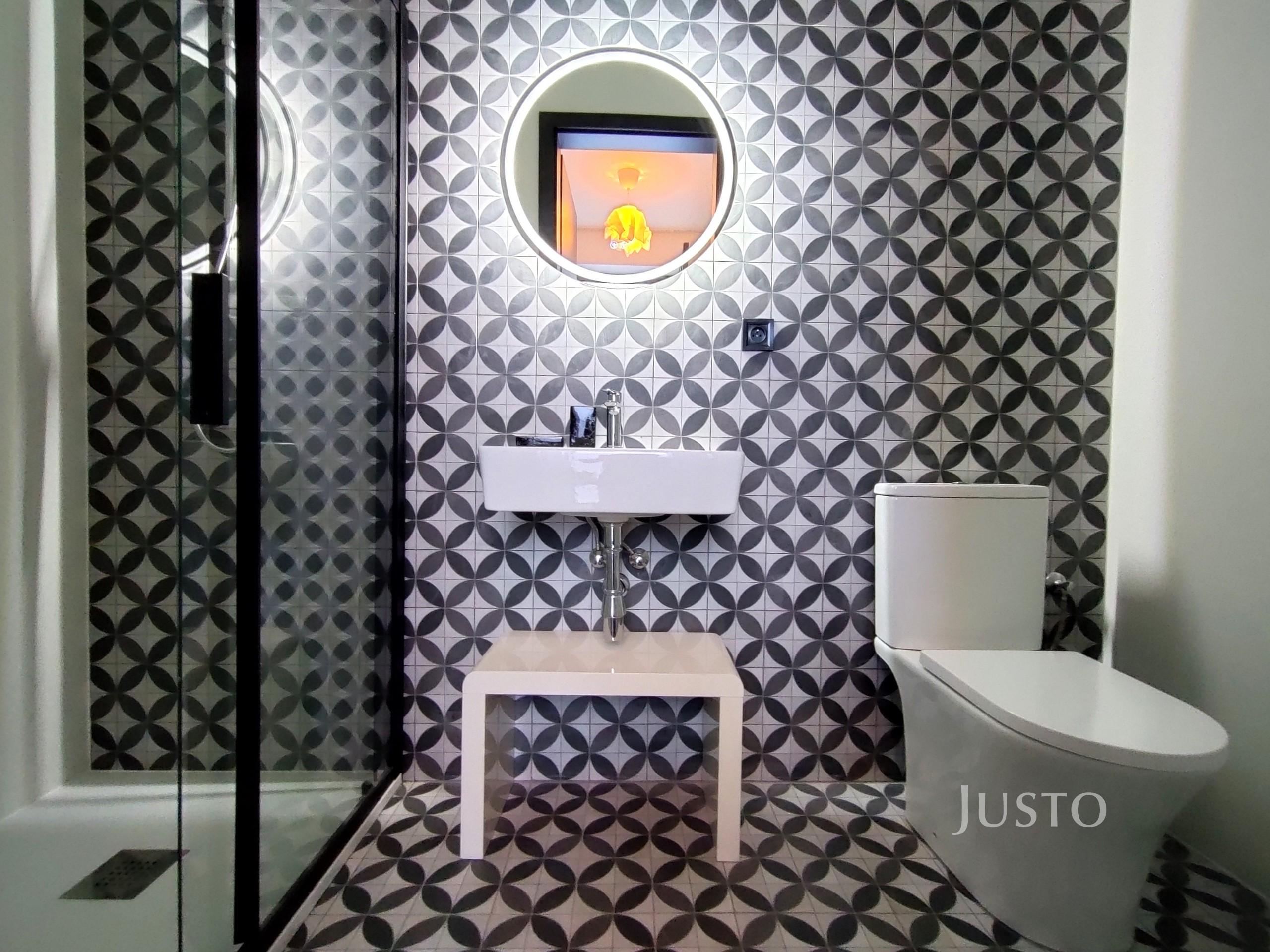 Kuchyně je netradičně schovaná za posuvnými dveřmi, které se dají zcela zavřít a vytváří tak dojem skříně, byt má podlahové vytápění v celém prostoru a velká ateliérová okna.
