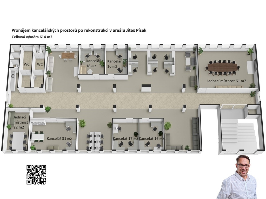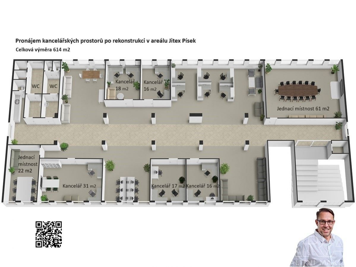 Nabízím Vám příležitost pronajmout si modernizované kancelářské prostory o výměře 614 m2 v areálu Jitexu Písek. Tato nabídka je ideální pro podnikatele, kteří chtějí prvotřídní pracovní prostředí a moderní zázemí pro svoji firmu. Ať už hledáte optimální a moderní pracovní prostředí pro Vaši firmu nebo přesun kanceláří z centra města s výraznou úsporou a chcete dostatek prostoru pro váš rozvoj, zde najdete řešení.