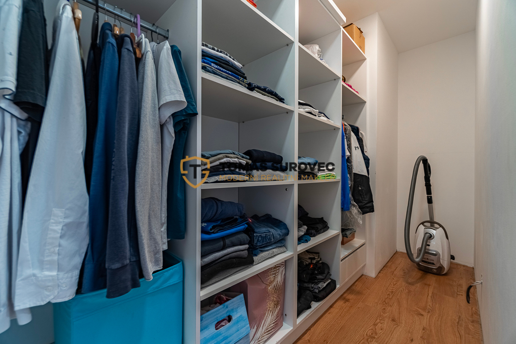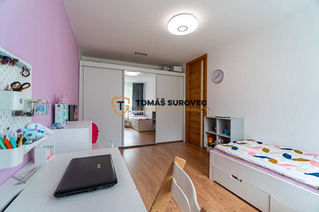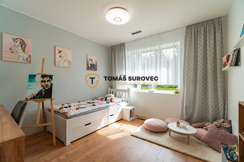 Soukromou část domu tvoří ložnice s vlastní šatnou a dva neprůchozí dětské pokoje. K dispozici je samostatné WC a luxusní koupelna s volně stojící vanou, sprchovým koutem a dvěma umyvadly.