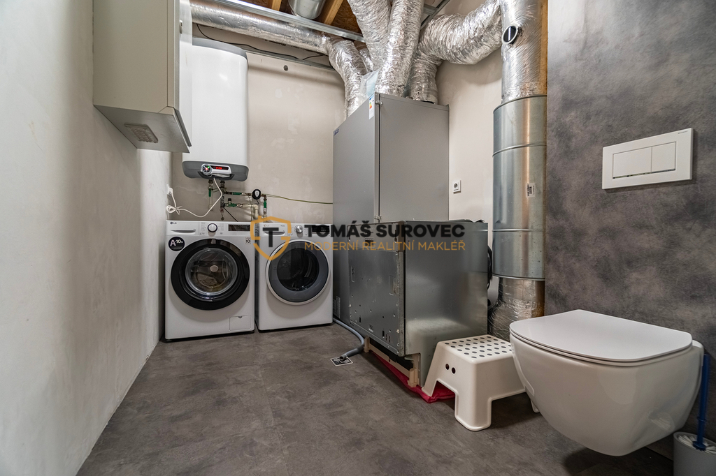 Technická místnost chytře ukrývá pračku, sušičku, rekuperační jednotku i další toaletu. Všechny technologie jsou maximálně efektivní a šetrné k provozním nákladům.