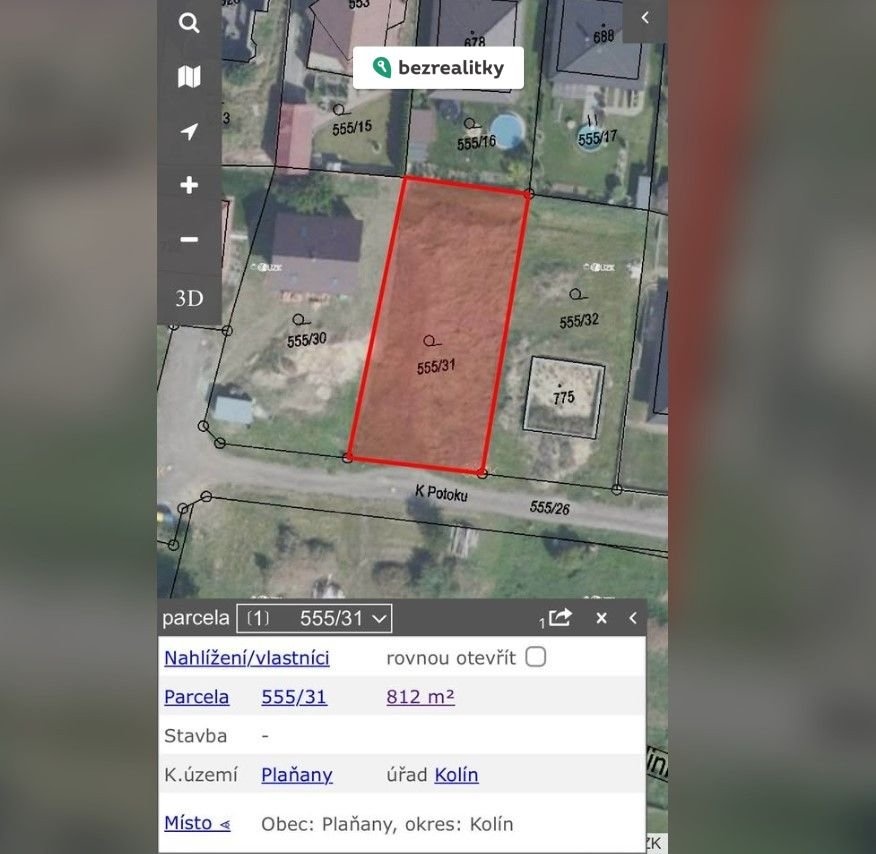Nabízím k prodeji připravený stavební pozemek o výměře 812 m² v obci Plaňany, okres Kolín. Pozemek se nachází v novější rezidenční zástavbě, na zpevněné komunikaci s veřejným osvětlením, s kompletními inženýrskými sítěmi přímo na hranici pozemku.