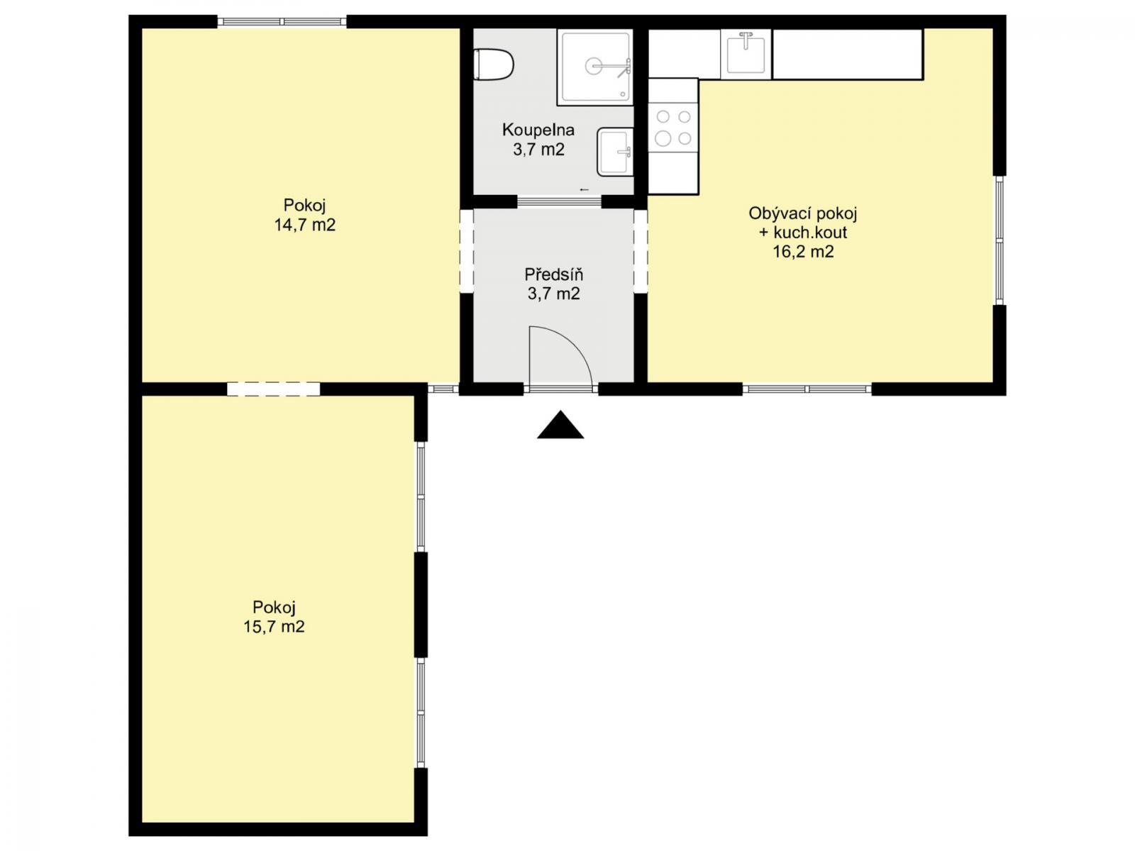 Dispozice je řešena následovně, je zde vstupní chodba, koupelna se sprchovým koutem, obývací pokoj s kuchyňským koutem a 2 ložnice.