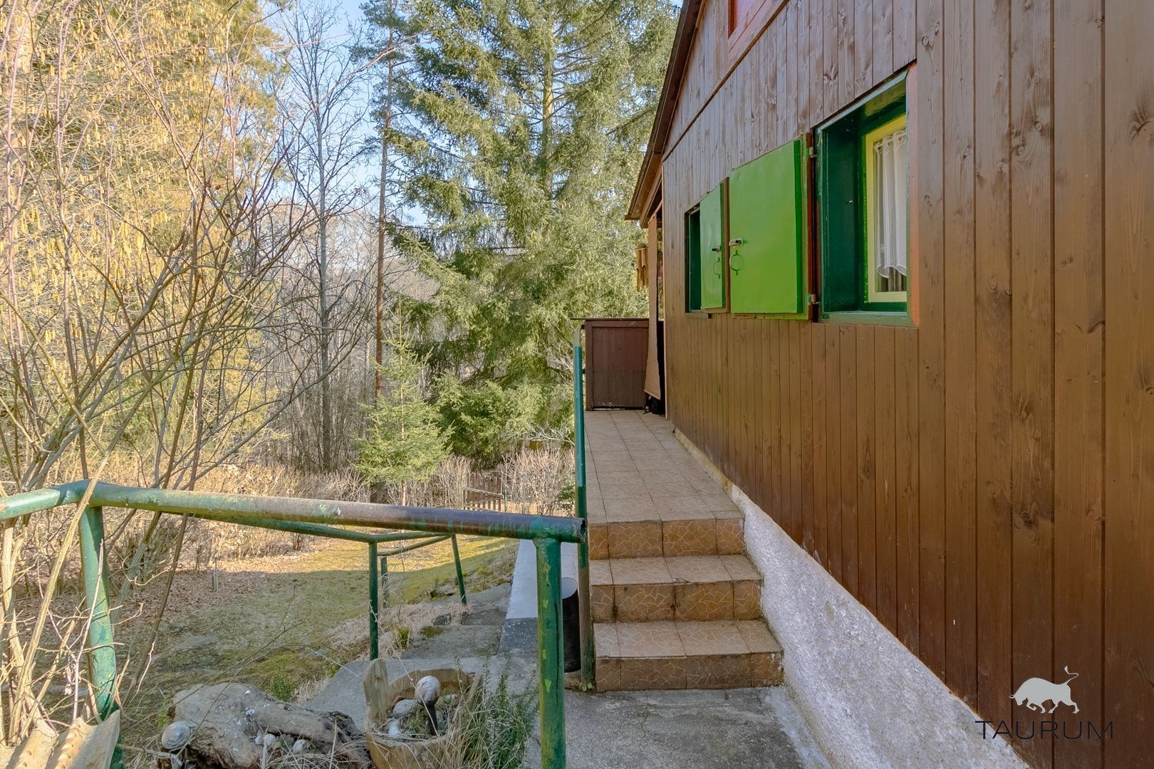 Chata stojí na vlastním pozemku o rozloze 270 m2 s okrasnými dřevinami a krytou pergolou.