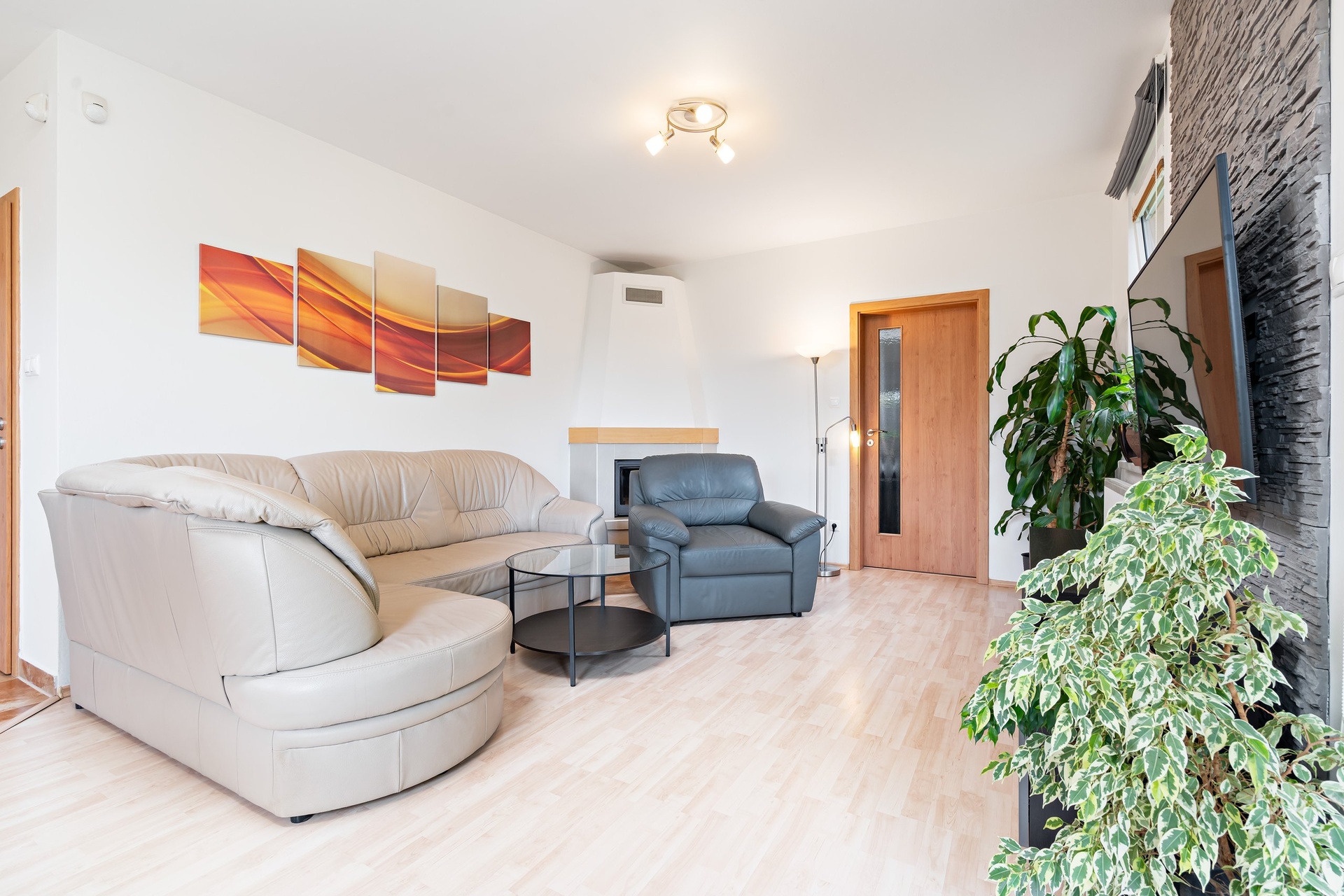- topení kombinace podlahového topení a radiátorů, krb v obývacím pokoje