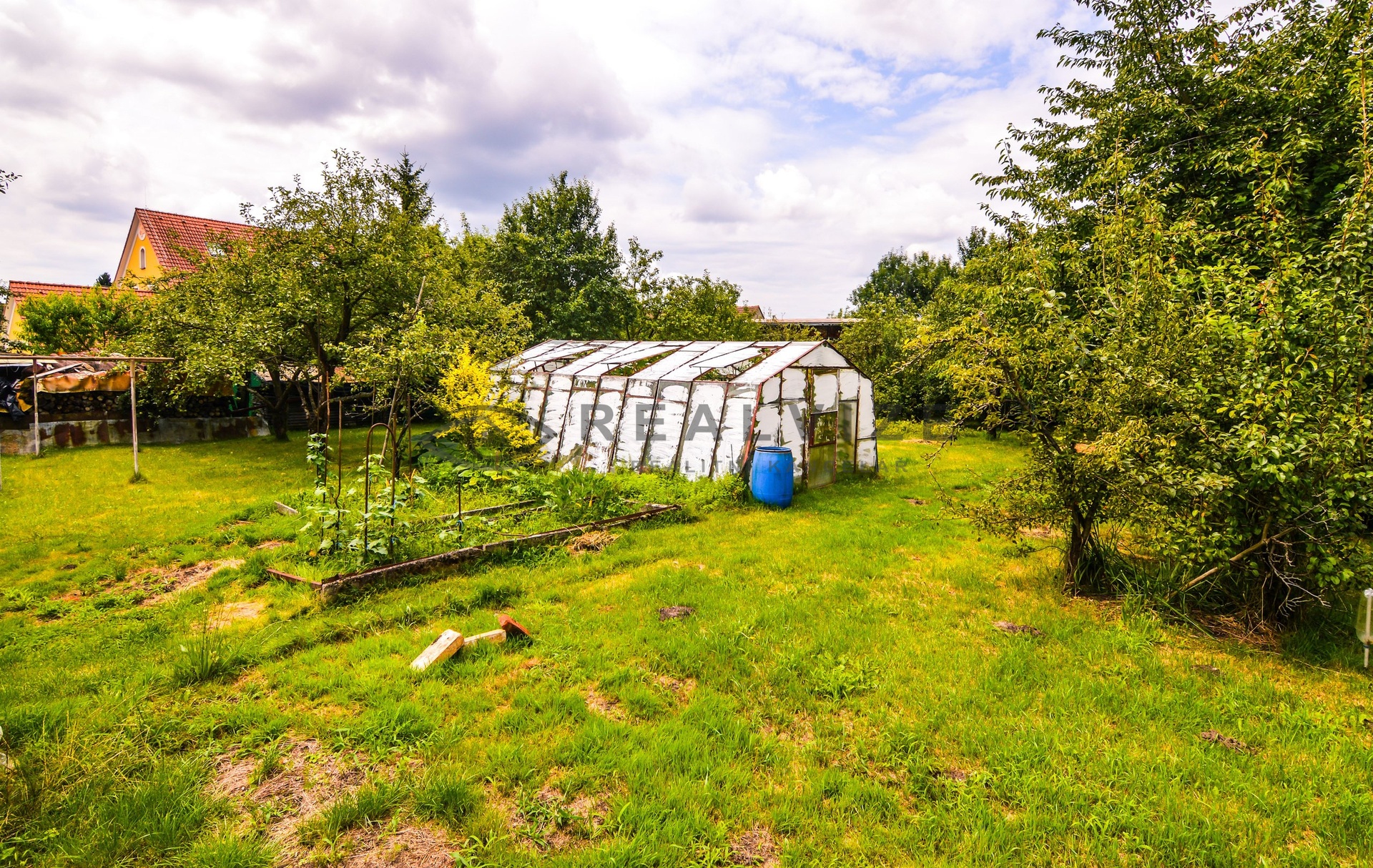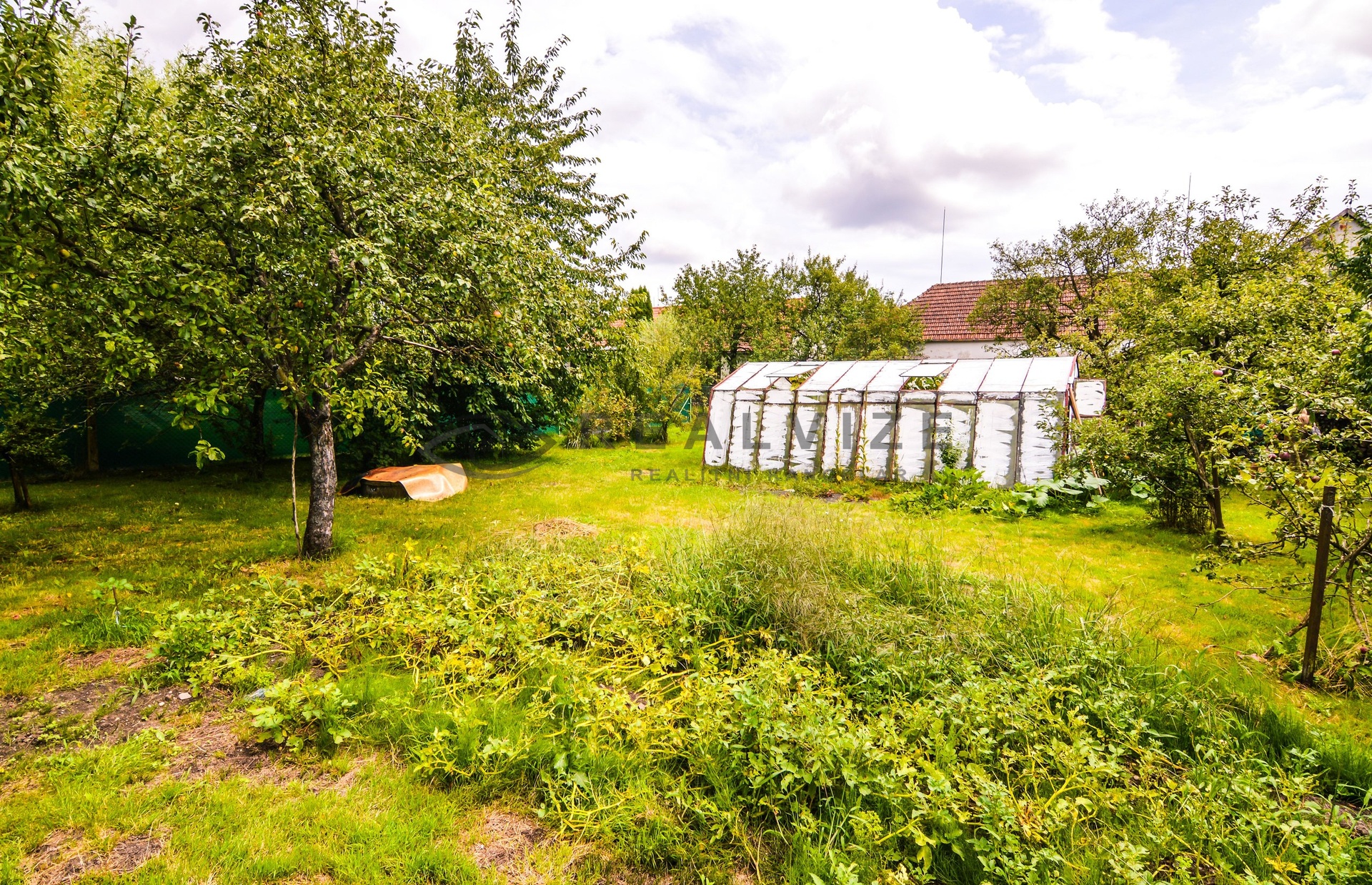 Za obytnými částmi je velká dřevěná kolna, zděný kurník a maštal, na jejíž úrovni již vstupujeme do rozlehlé, kompletně oplocené zahrady (889 m2) se skleníkem a vzrostlými ovocnými stromy a keři.