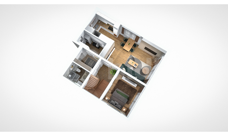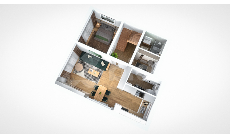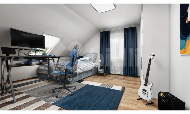 V přízemí se nachází prostorný obývací pokoj s kuchyňským koutem, jeden pokoj, koupelna a technická místnost. V rohu obývacího pokoje se nachází komín, na který je možné připojit krbová kamna. Na terasu se dostanete jak z obývacího pokoje tak z ložnice francouzským oknem. V prvním NP jsou 3 obytné pokoje, koupelna a samostatné WC.