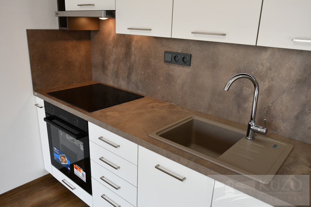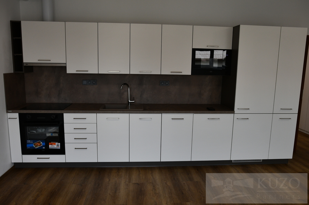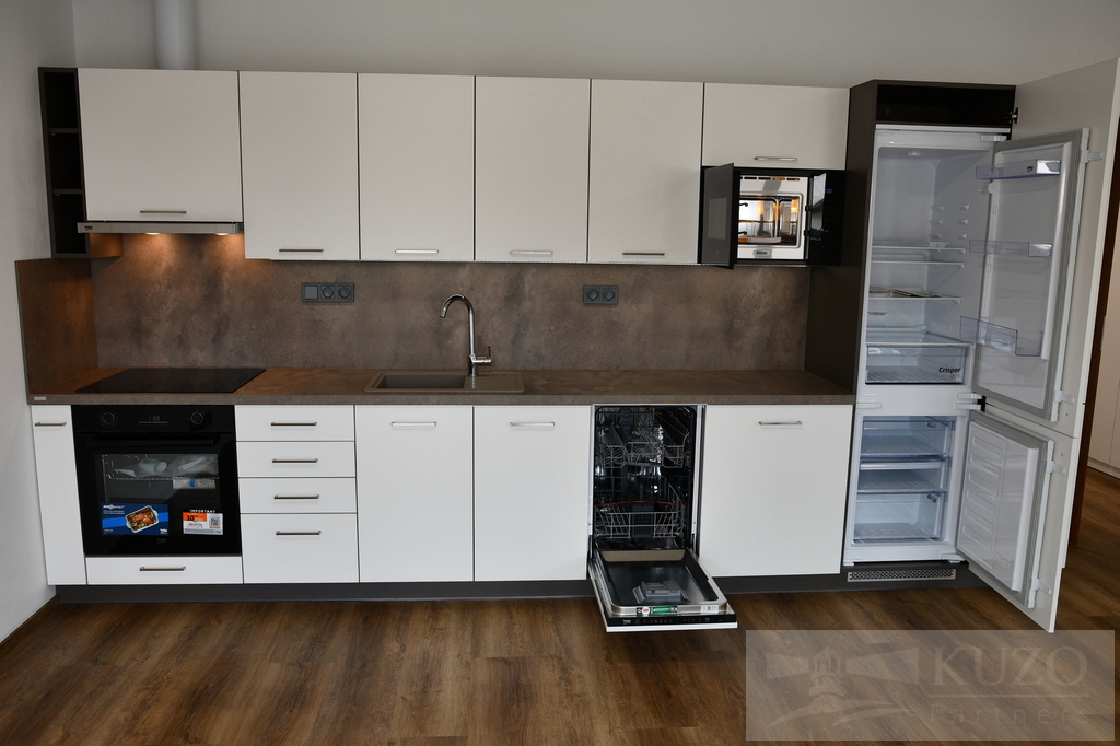 Kuchyňská část bytu je plně vybavená moderními elektrospotřebiči, včetně elektrické varné desky, pečící trouby, digestoře, myčky a ledničky s mrazničkou, což jistě potěší každého milovníka vaření. Velkorysá lodžie nabízí dostatek prostoru pro posezení a užívání si slunečných chvil, zatímco velká okna propouštějí do interiéru dostatek denního světla.