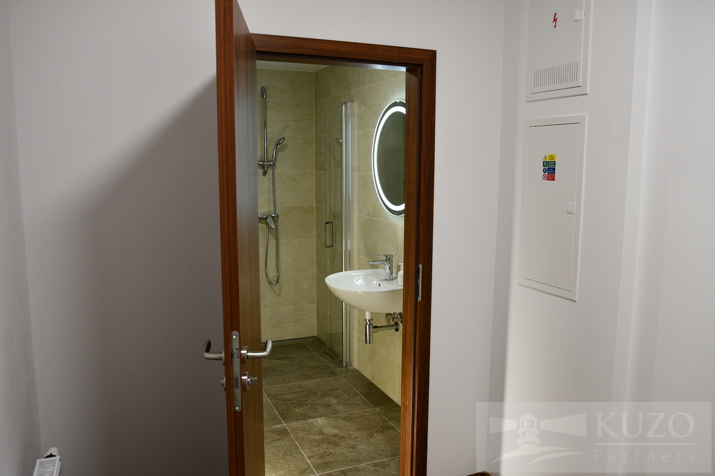 Koupelna je prostorná a vybavená sprchovým koutem, moderním prosvětleným, kruhovým zrcadlem. Příprava na pračku je samozřejmostí.
