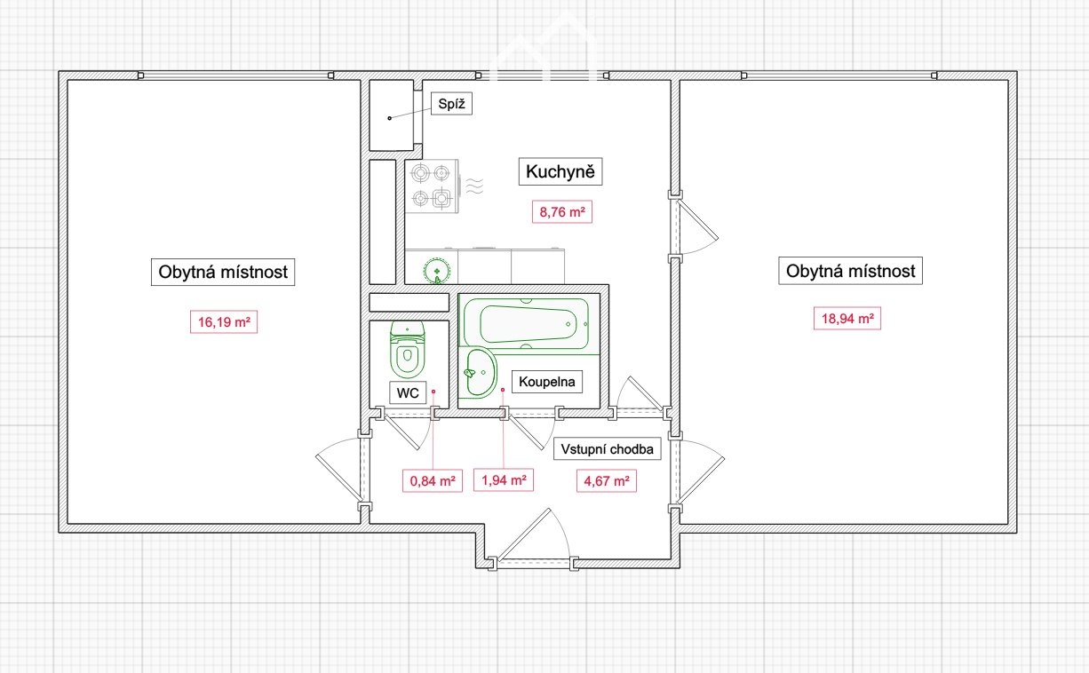 • Dispozice: 2+1 s neprůchozími pokoji + sklepní kóje