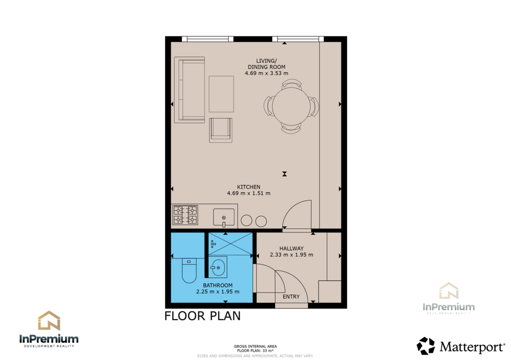 Dispozice bytu tvoří hlavní obytný prostor s kuchyňským koutem, dále koupelna a vstupní chodba. K bytu náleží také sklepní kóje o velikosti cca 2 m². Dispozice je praktická a umožňuje efektivní využití prostoru i budoucí úpravy.