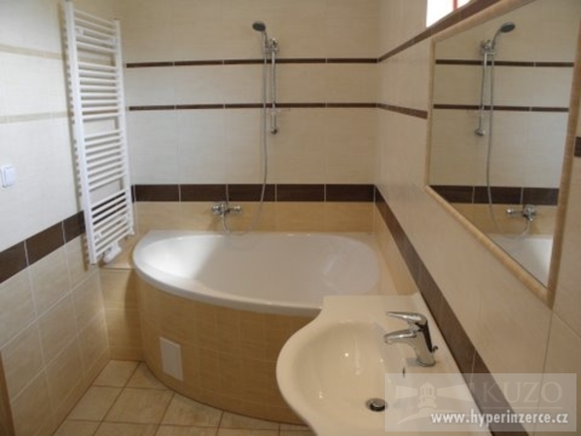 Koupelna s rohovou vanou a umývadlem. Denní světlo a výměnu vzduchu zajišťuje větrací okno.