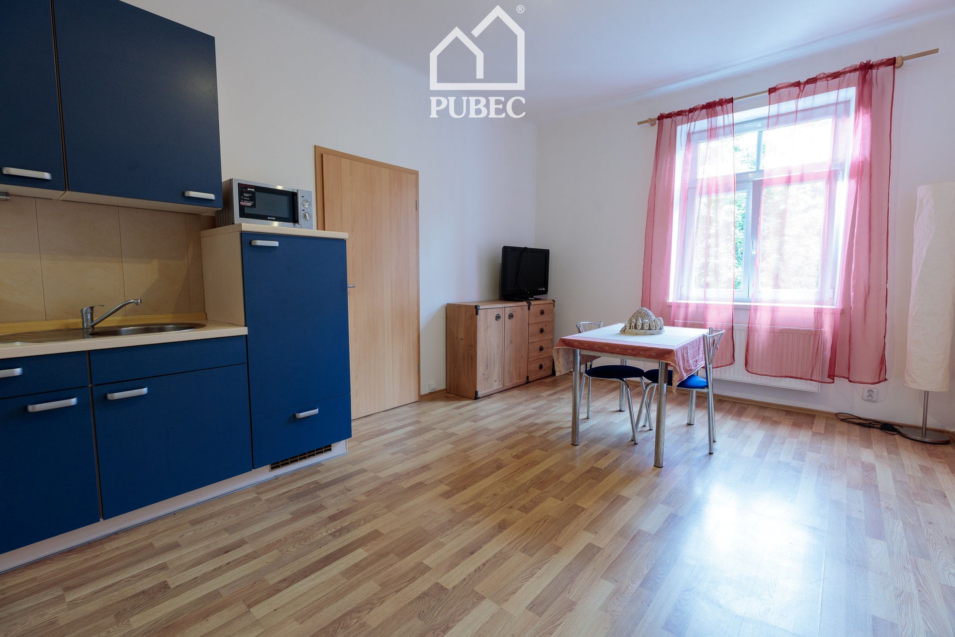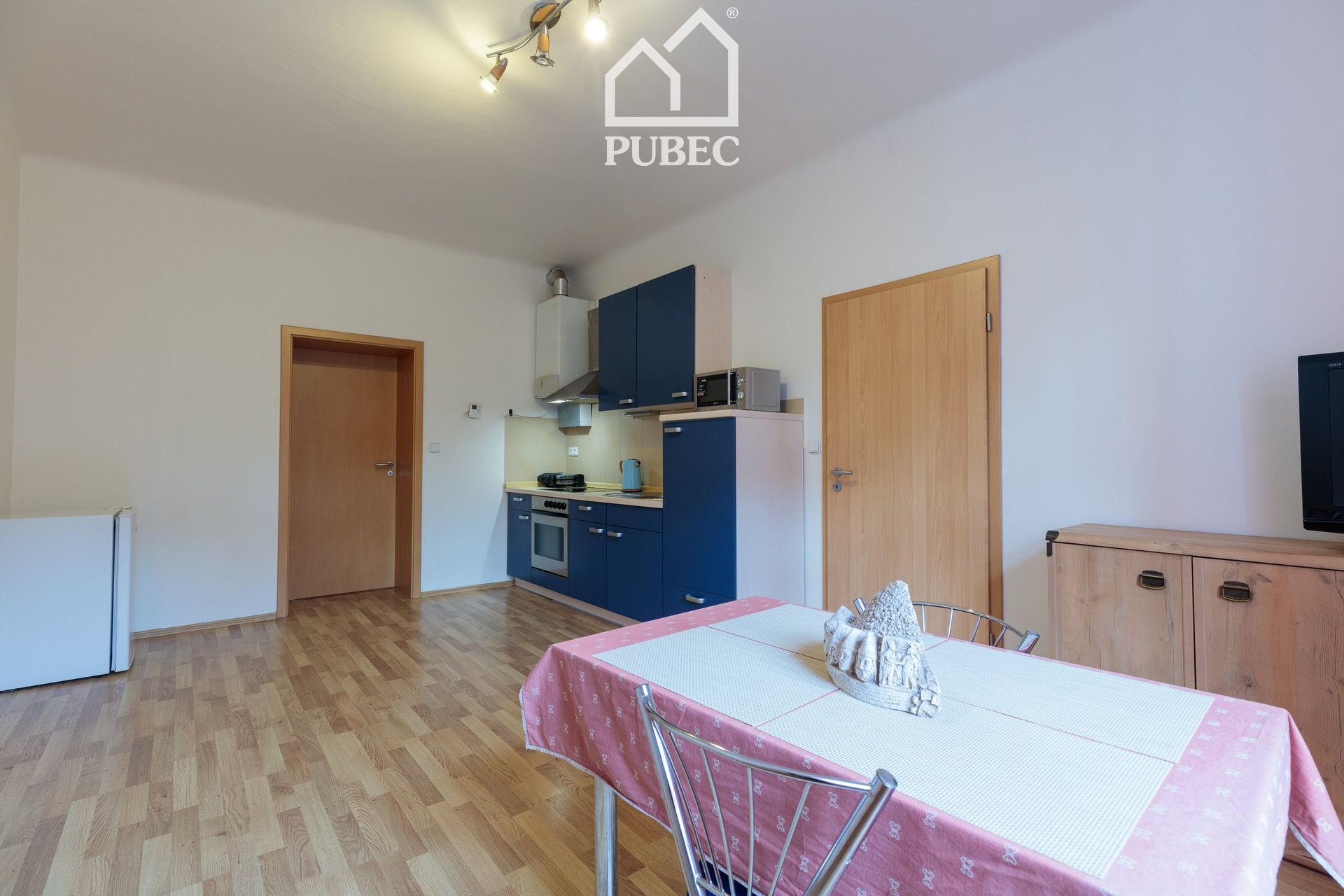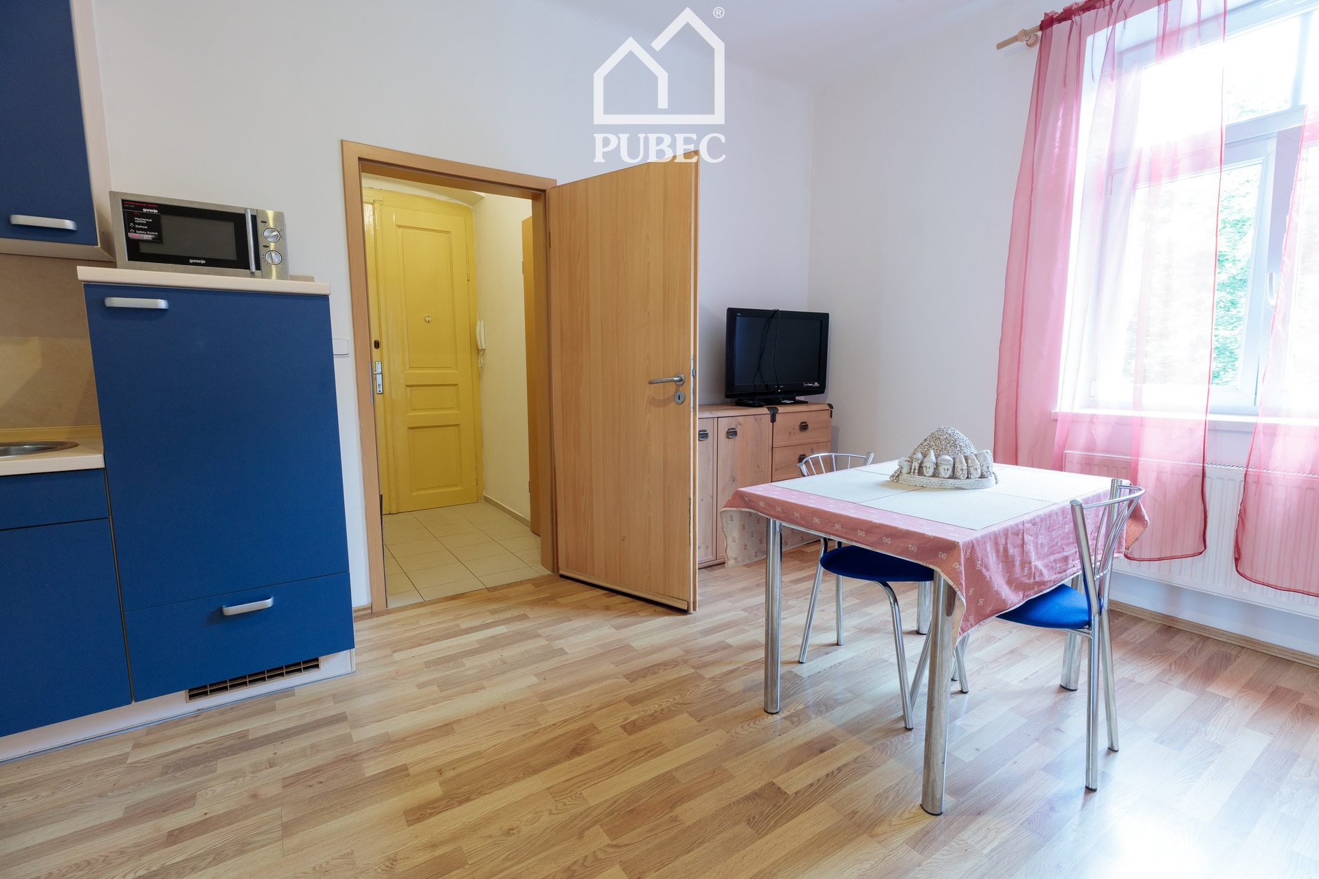 Praktické uspořádání: Dva světlé pokoje – jeden s plně vybavenou kuchyňskou linkou včetně spotřebičů.