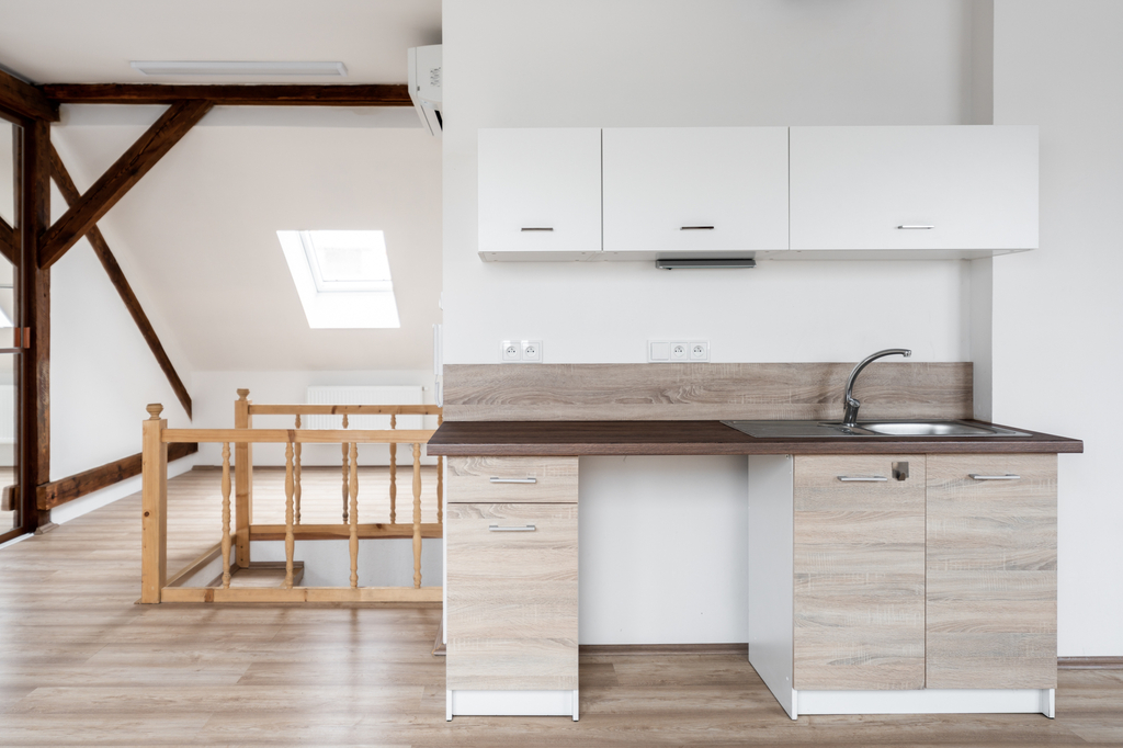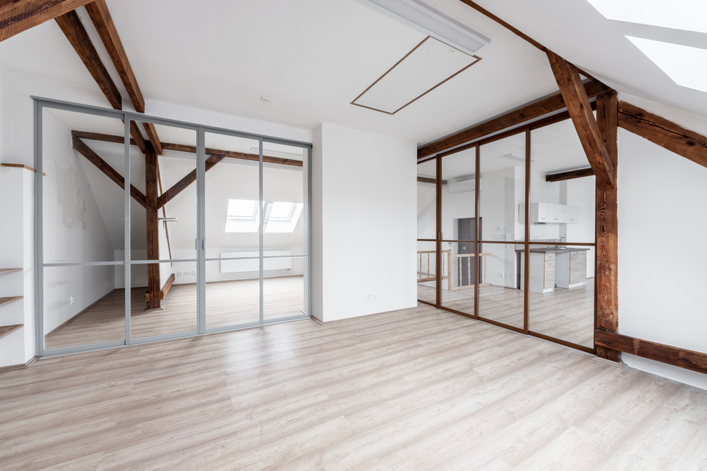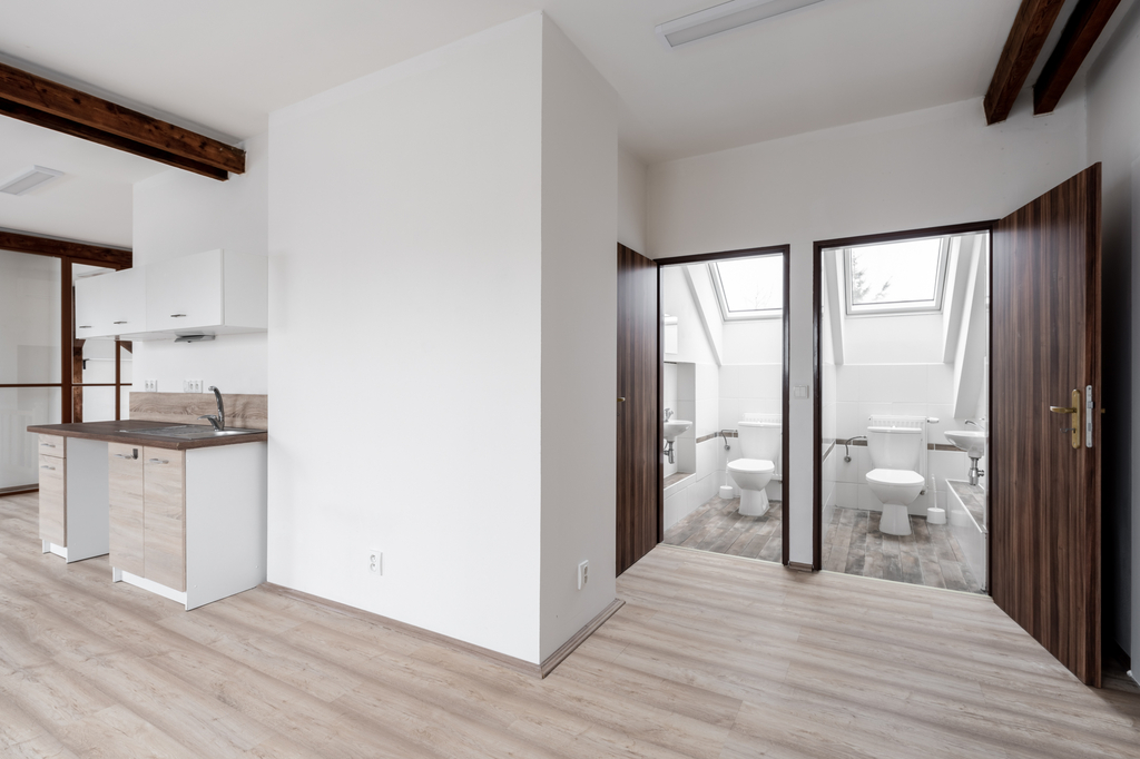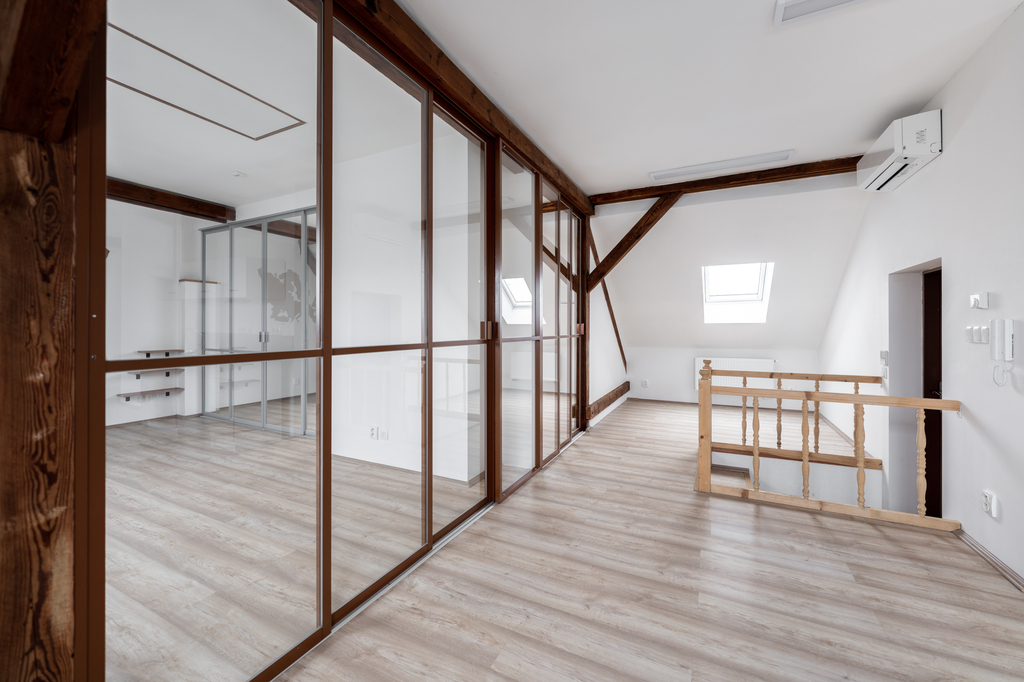 Ateliér je rozdělen skleněnými příčkami na dvě samostatné místnosti a centrální část s kuchyňskou linkou. Součástí prostor jsou také dvě samostatné toalety.