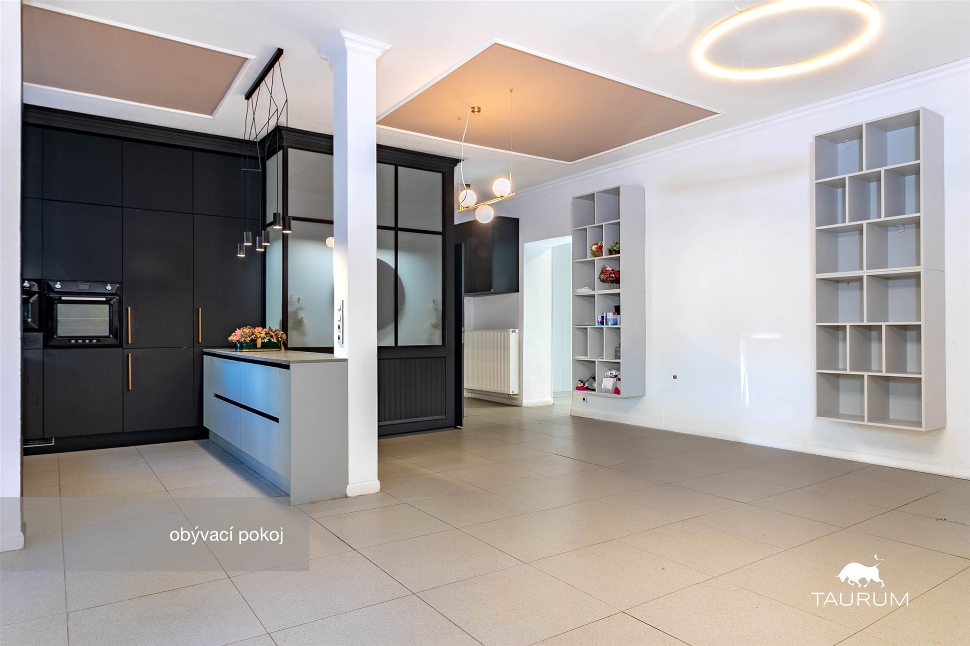 Dominantou bytu je velkorysý obývací pokoj s kuchyňským koutem a funkčním krbem. Kuchyň i ostatní části bytu jsou vybaveny zakázkovým nábytkem na míru, který perfektně ladí s celkovým designem bytu a zároveň nabízí velké množství úložného prostoru. Kuchyňská linka disponuje značkovými spotřebiči a kamennou pracovní deskou.
