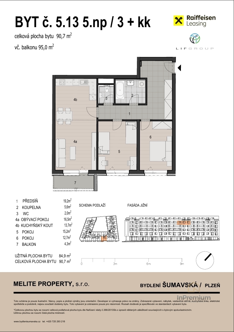 Nabízíme byt č. 5.13 o dispozici 3+kk v 5. nadzemním podlaží moderního rezidenčního projektu Bydlení Šumavská v Plzni. Celková plocha bytu činí 90,7 m² a balkon o velikosti 4,3 m² rozšiřuje obytný prostor směrem ven.